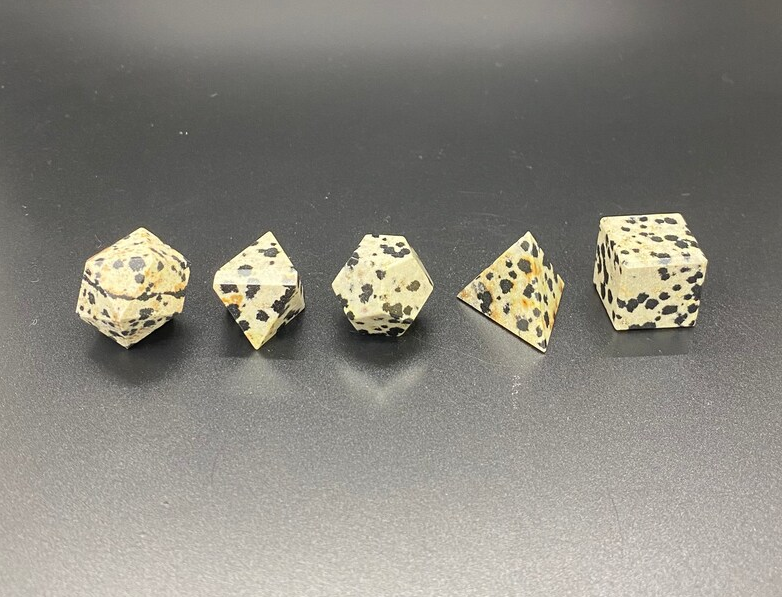 คริสตัลรูปทรงเรขาคณิต dalmatian Jasper ชุด5ชิ้นแกะสลักหินธรรมชาติอันศักดิ์สิทธิ์สำหรับการรักษา platonic ของแข็งรูปทรงเรขาคณิตที่ไม่ซ้ำกัน