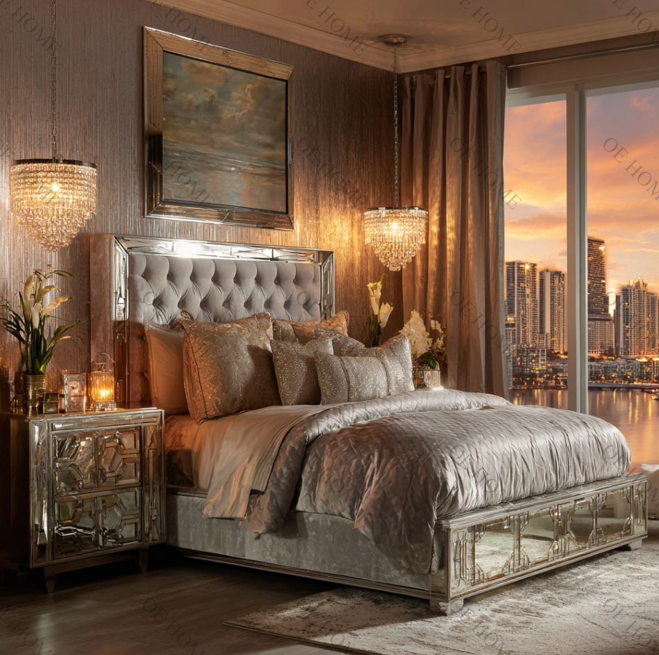 ชุดเครื่องนอนผ้ากำมะหยี่สีดำสำหรับห้องนอนโรงแรมกรอบกระจก LED ประดับเตียงขนาดคิงส์ปรับได้ประดับคริสตัล