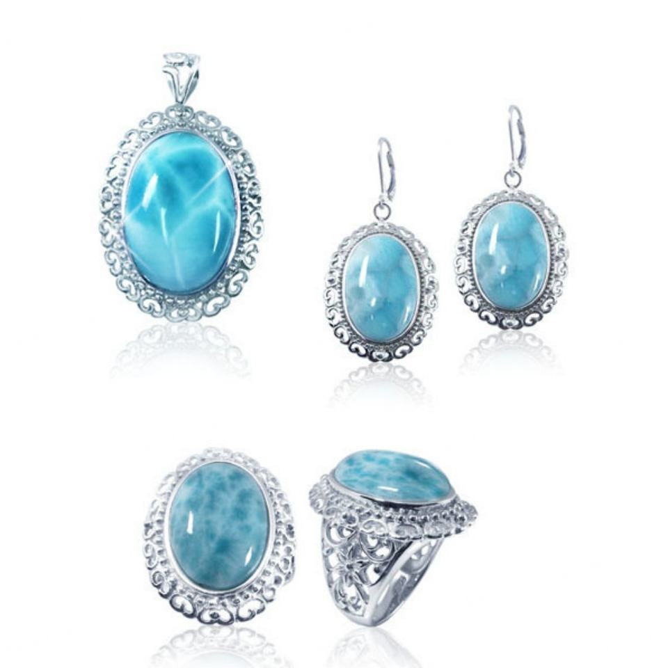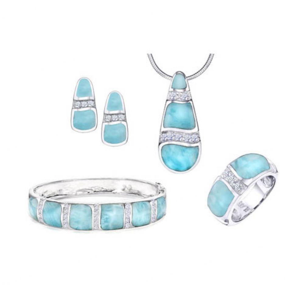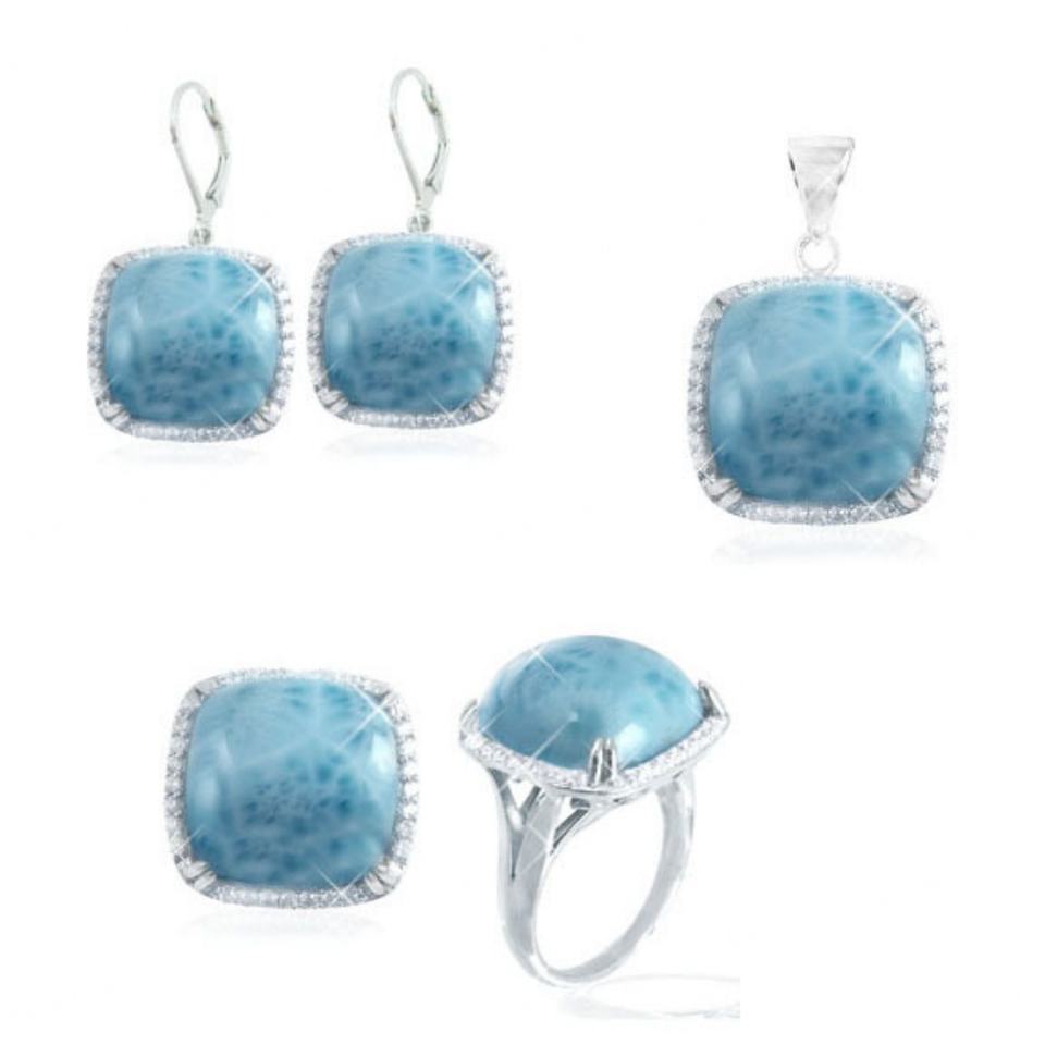 ชุดเครื่องประดับเงินแท้ 925 ประดับด้วยลาร์ิมาแท้และเพชรคิวบิกเซอร์โคเนียทรงรัศมี