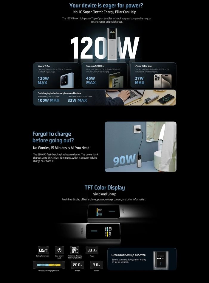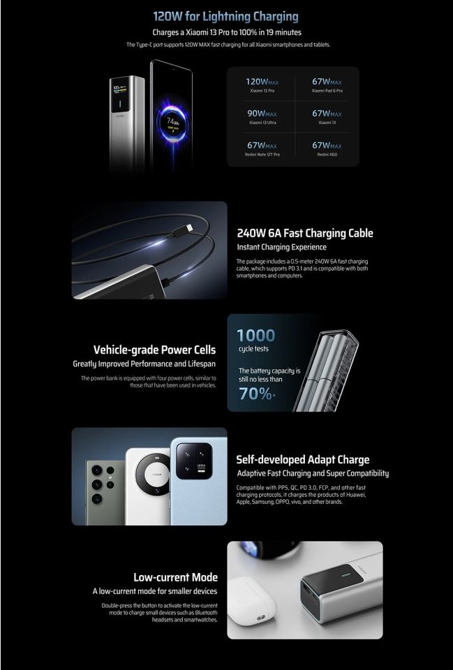 Fast Charging, ความจุสูง, สำหรับกลางแจ้ง, จอแสดงผล LED, แบบพกพา, พร้อมสายเคเบิลประเภท
