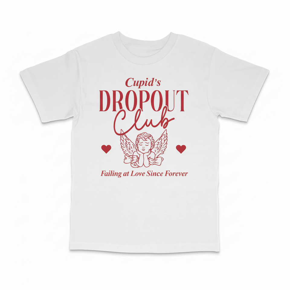 เสื้อยืดคิวปิดส์ ดรอปเอาท์ คลับ เฮฟวี่เวทเสื้อยืดลายกราฟิกวันวาเลนไทน์ตลก เสื้อคอกลมแขนสั้นผ้าฝ้ายสำหรับทั้งชายและหญิง