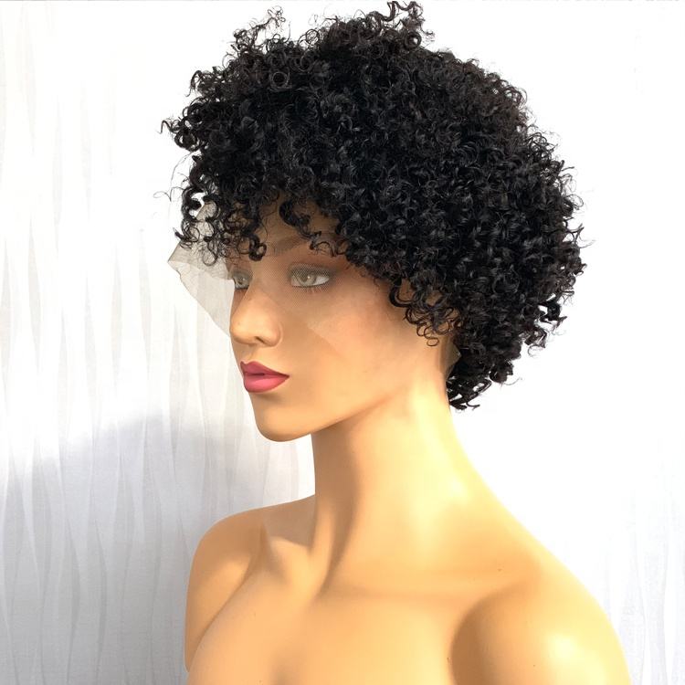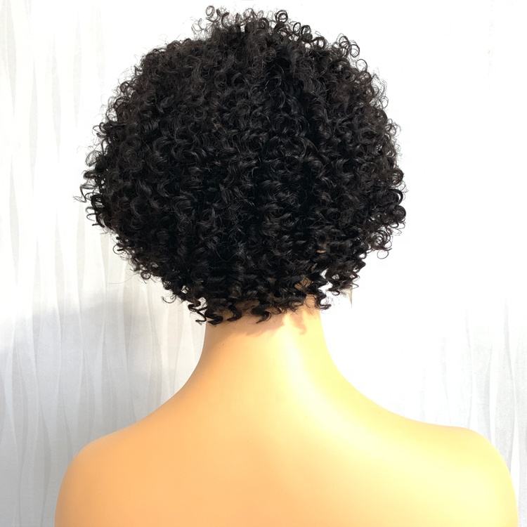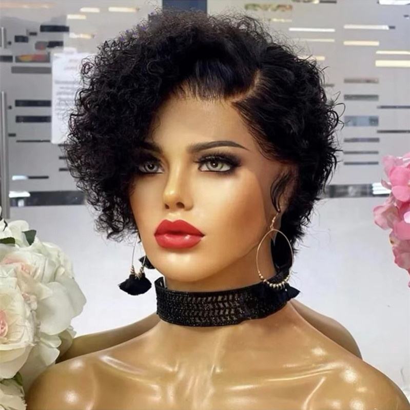 วิกผมหยิกหยักศกด้านหน้าวิกผมพิกซี่แบบสั้นโปร่งใสสำหรับผู้หญิงผมคนบราซิลแบบสั้นสไตล์สีดำ