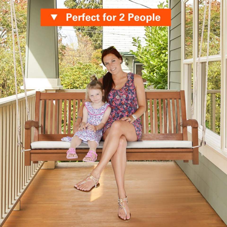 Curved Back 2-Person Wood Bench Swing with Cushion Hanging Porch Patio Swing