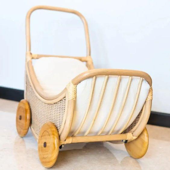 รถเข็นเด็กหวายไม้ไผ่พร้อมกรอบไม้ดีไซน์โค้ง