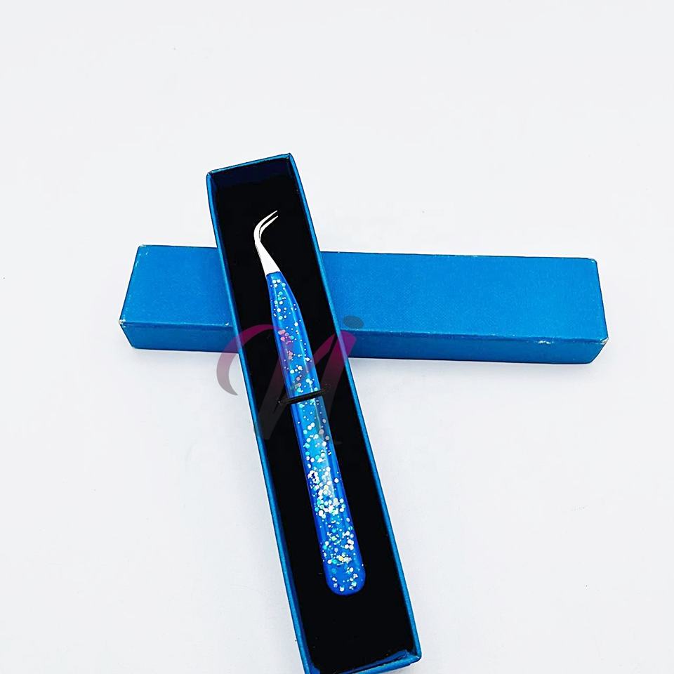 แหนบต่อขนตาแบบโค้งเคลือบเจลแวววาวที่มีประสิทธิภาพในการป้องกันการกัดกร่อนที่ยั่งยืนแหนบขนตาสีฟ้า