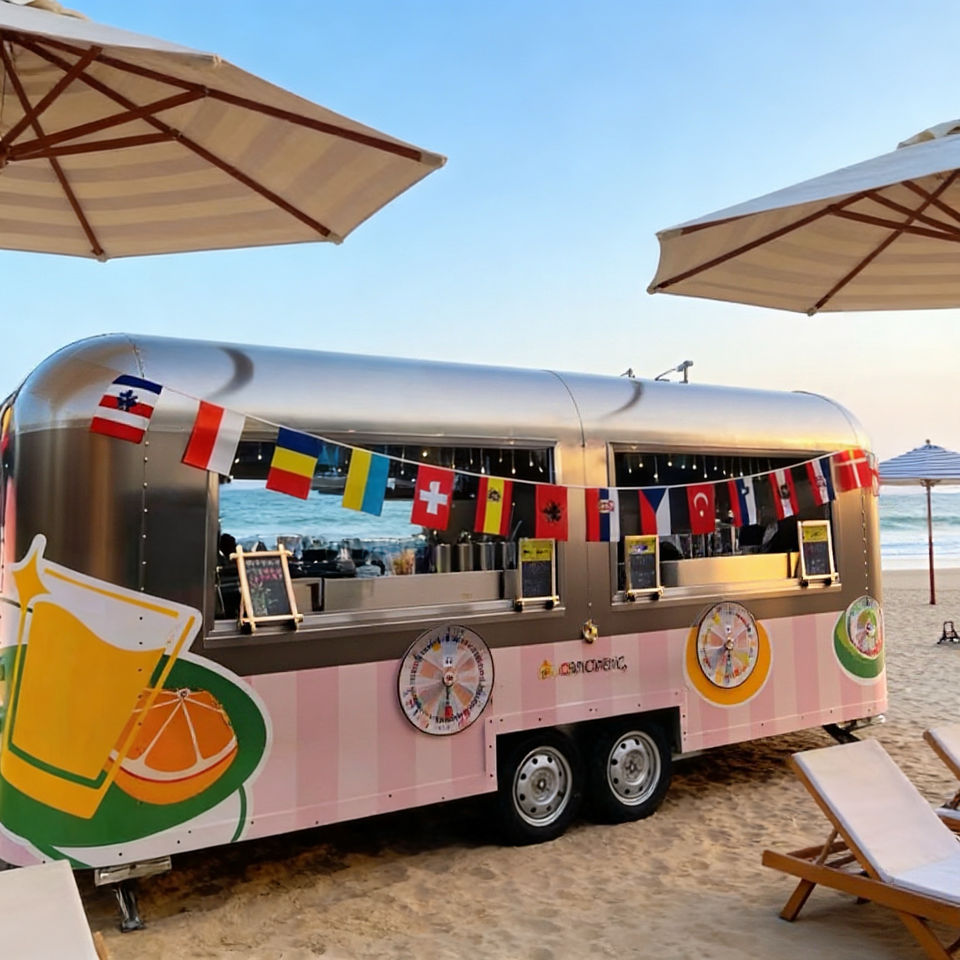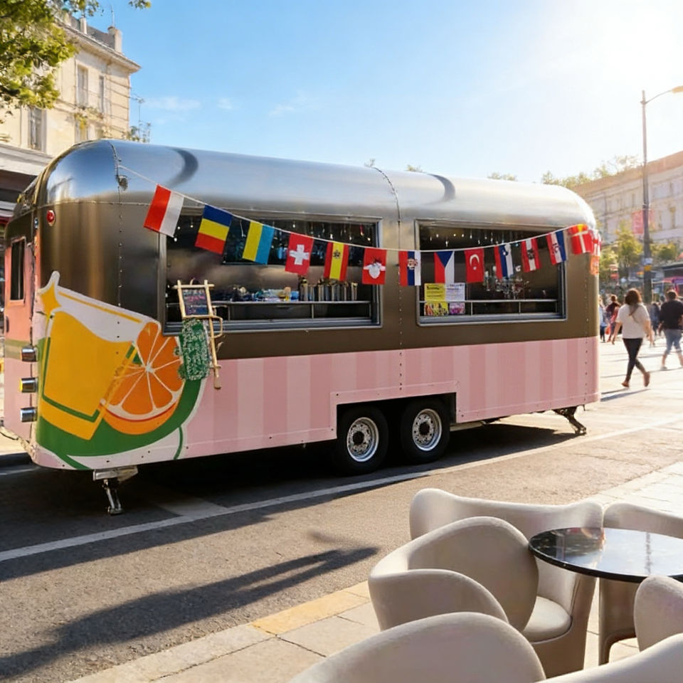 รถเข็นขายอาหารเคลื่อนที่สแตนเลสโค้งมน สีชมพูและเขียว สำหรับขายอาหารนานาชาติและขนมหวาน
