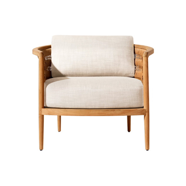 เก้าอี้เท้าแขนกลางแจ้งทำจากไม้สักและหวายทอพร้อมเบาะรองนั่ง