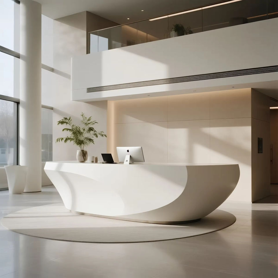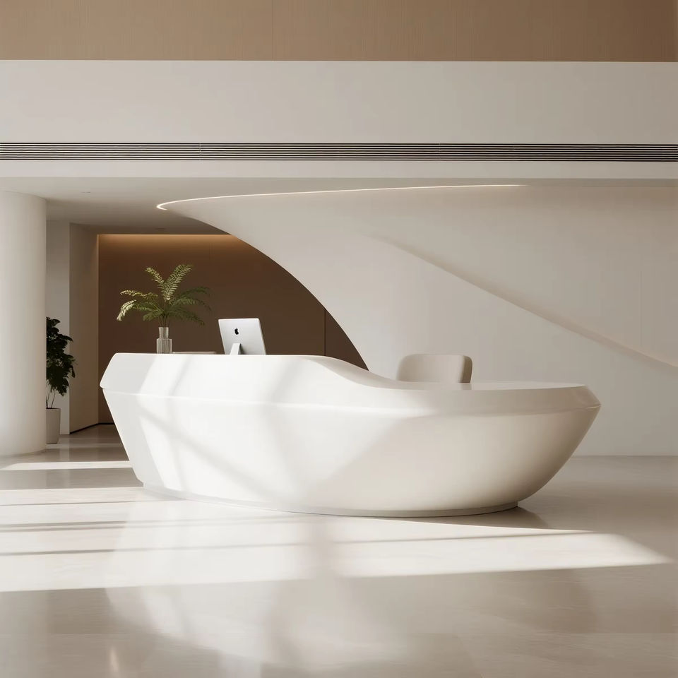 เคาน์เตอร์ต้อนรับแบบโค้ง สีขาว ขยายได้ สไตล์มินิมอล สำหรับพื้นที่ทำงานสมัยใหม่ โรงแรม และห้างสรรพสินค้า