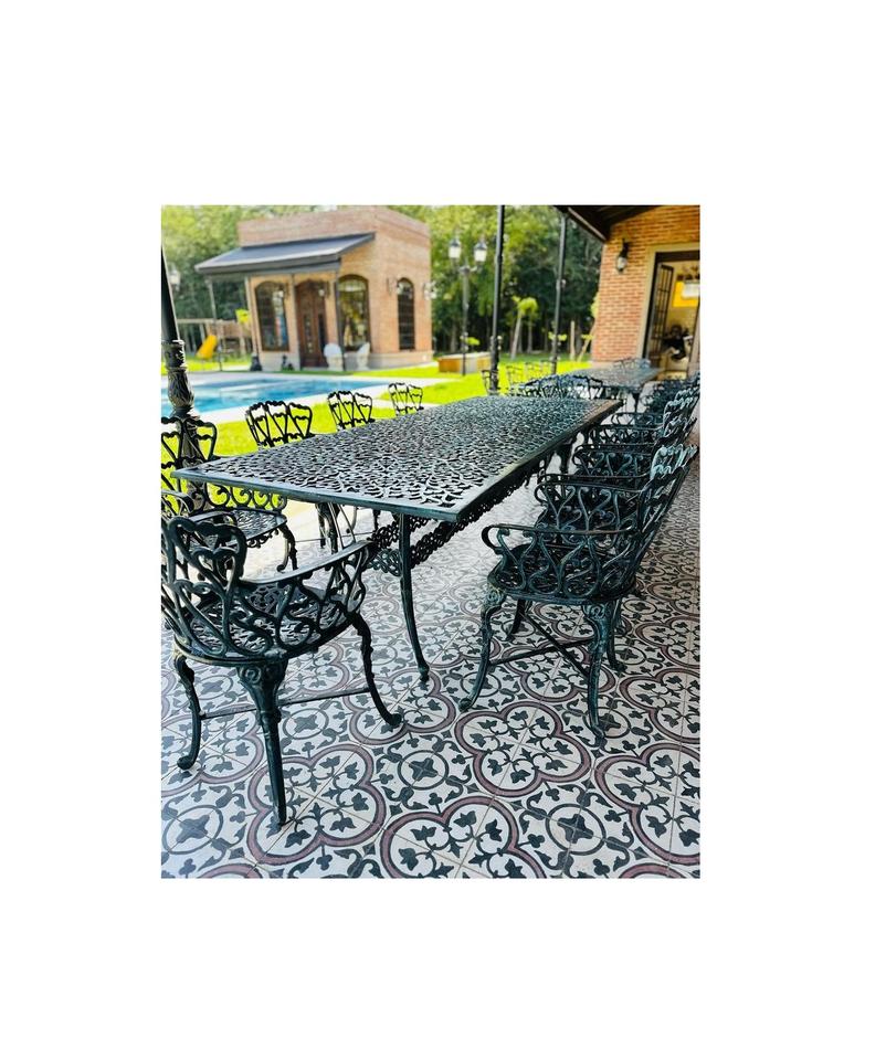 เก้าอี้หลังโค้งออกแบบเฟอร์นิเจอร์เหล็กหล่อสำหรับสี่ที่สมบูรณ์แบบสำหรับสวนลานกับโต๊ะกลางแจ้งทรงกลมโบราณ