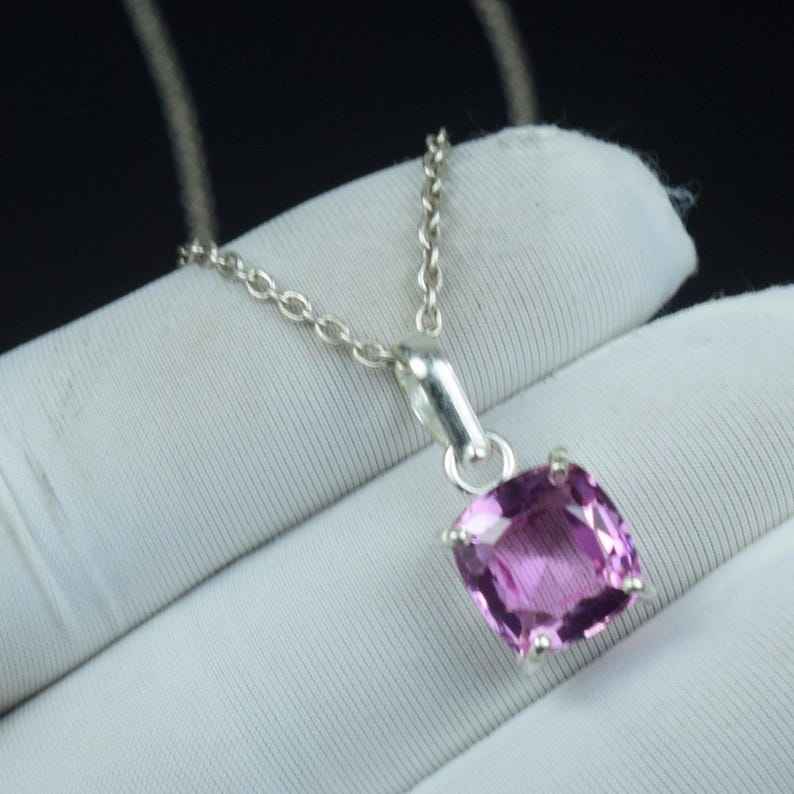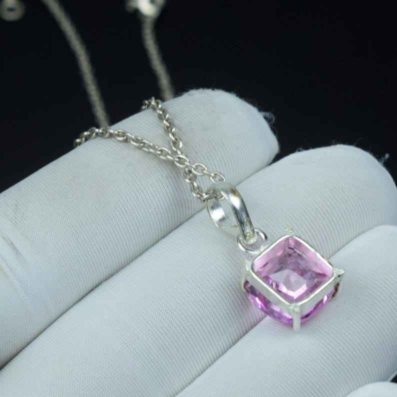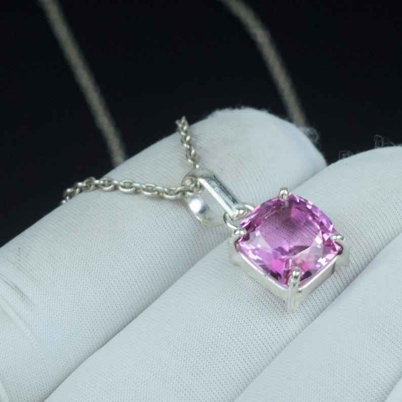 จี้คุนไซต์สีชมพูทรงคุชชั่น เงินแท้ 925 พร้อมสร้อยคอพลอยธรรมชาติ ของขวัญแต่งงาน/คริสต์มาส