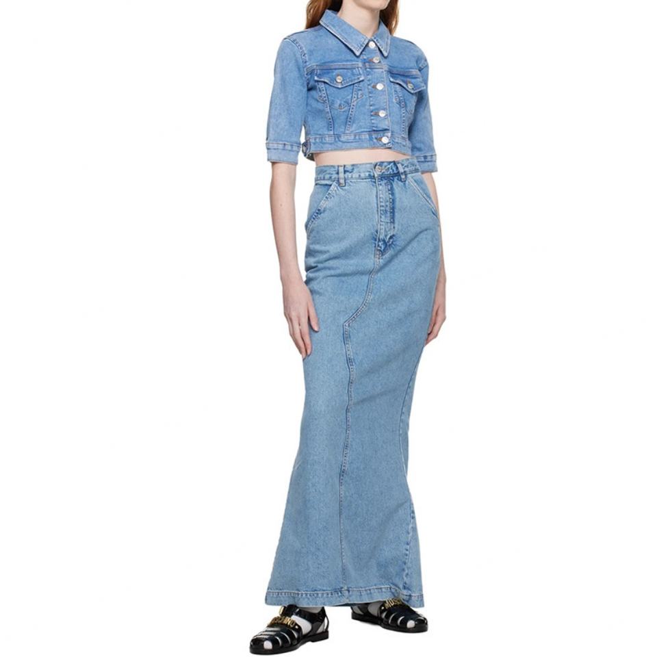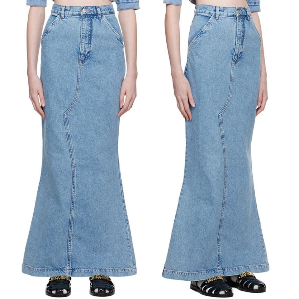 กระโปรงยีนส์ยาวทรงปลายบานแบบมีรูระบายอากาศ สีน้ำเงิน ผ้าฝ้ายแท้ 100% สำหรับผู้หญิง