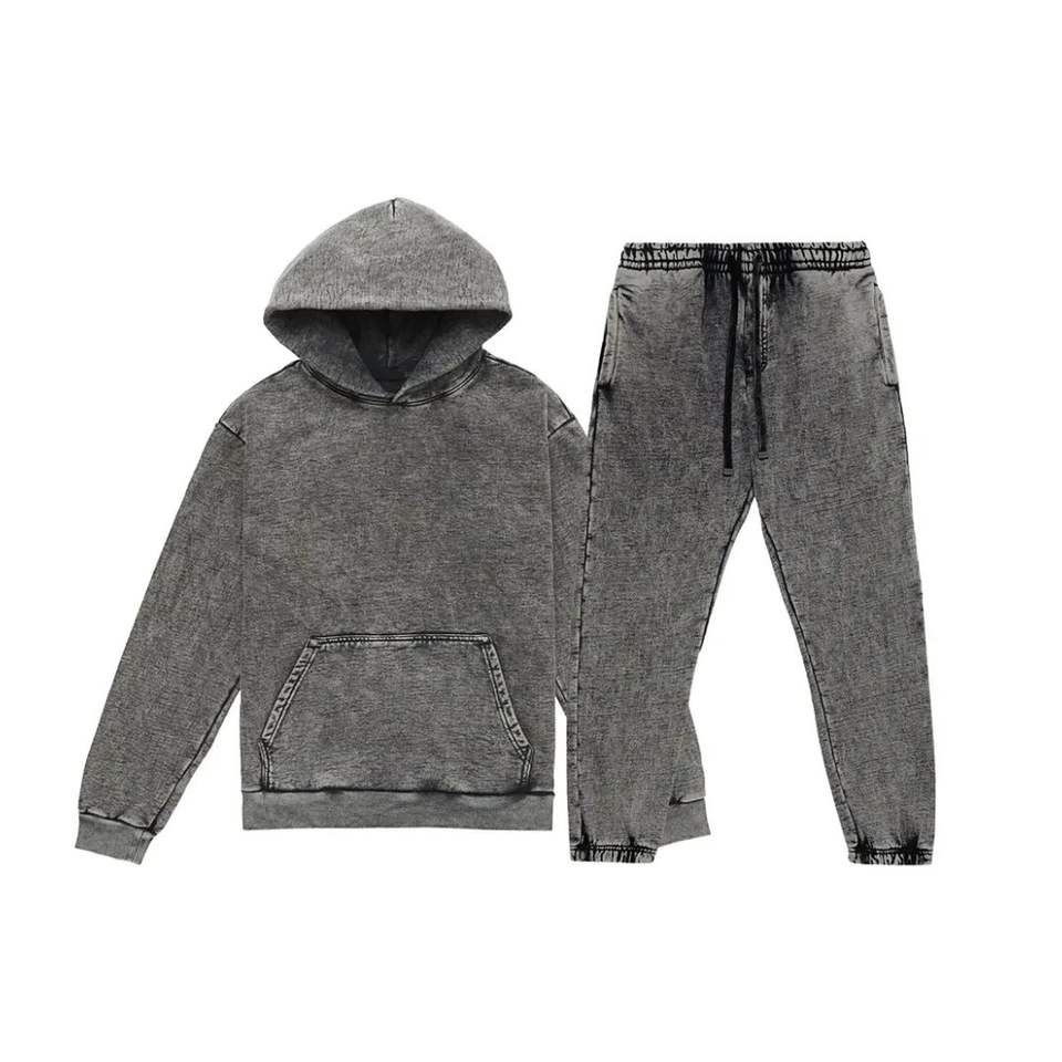 ชุดเซ็ตแทรคสูทผ้าฝ้ายแท้ 100% ทรงขาบาน ล้างสีแบบแอซิดวอช สไตล์ไฮสตรีท ชุดสองชิ้นทรงหลวม สตรีทแวร์ ฮู้ดดี้ไหล่ตก ไซส์พลัส