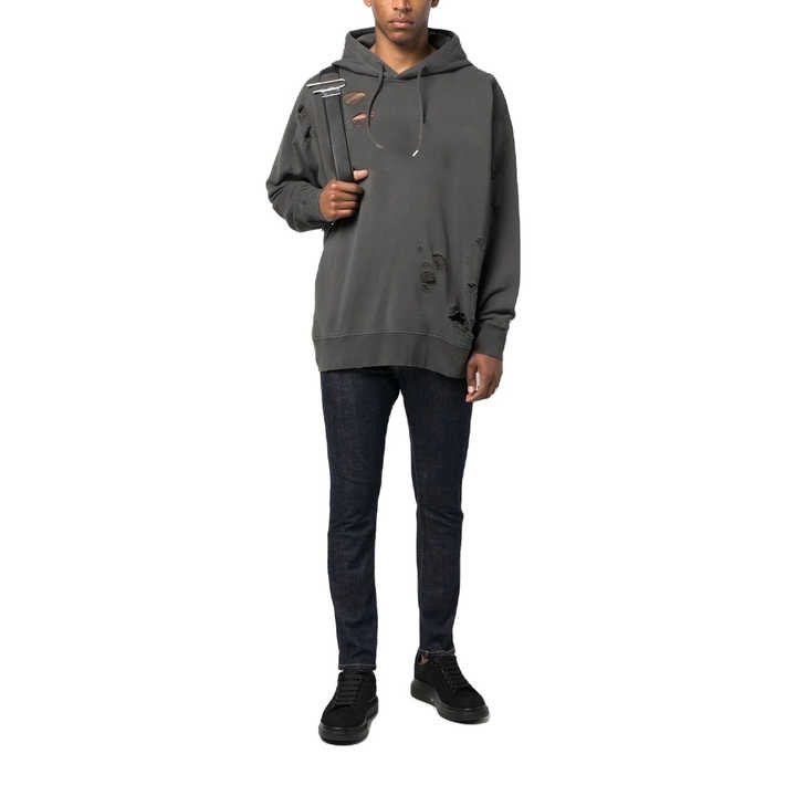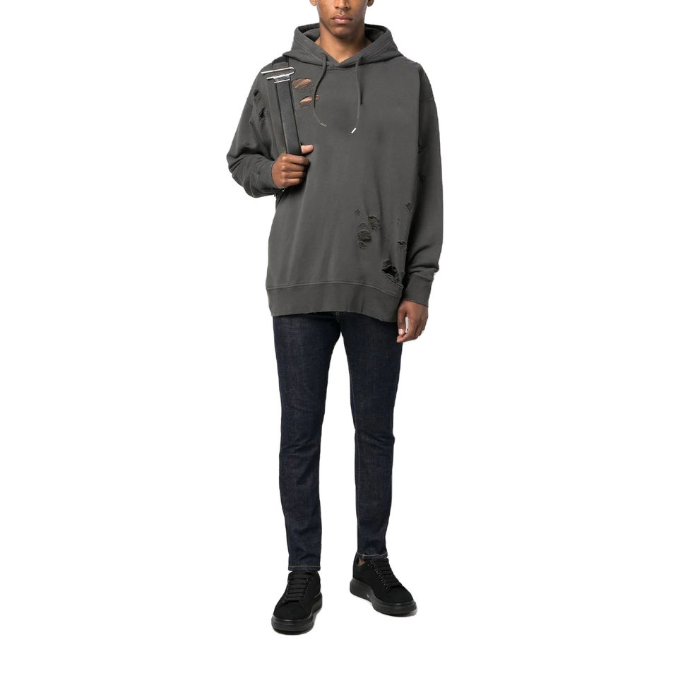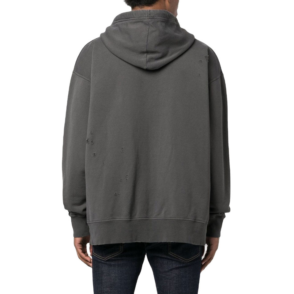 เสื้อฮู้ดดี้โอเวอร์ไซส์ผ้าฝ้ายฟลีซ 100% สำหรับผู้ชาย พิมพ์ลายโลโก้แบบดิสเทรสที่แขนเสื้อ พร้อมงานสกรีน