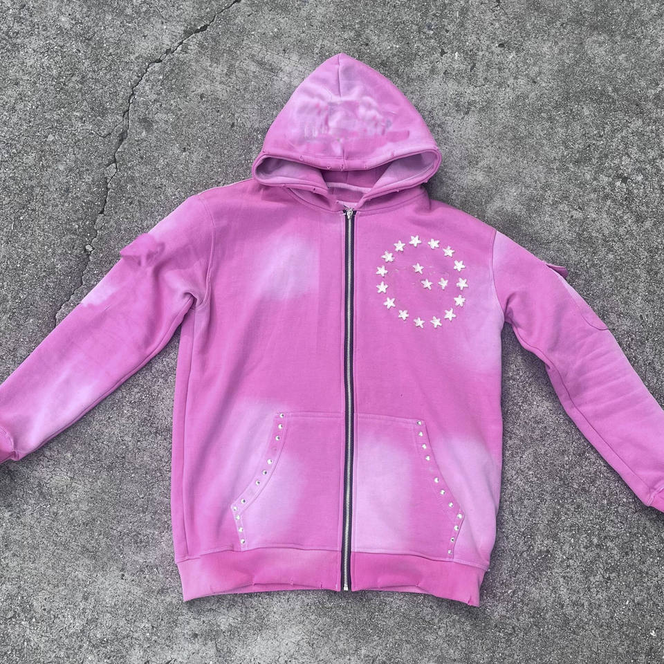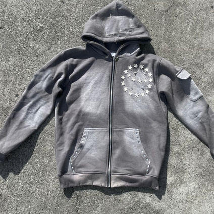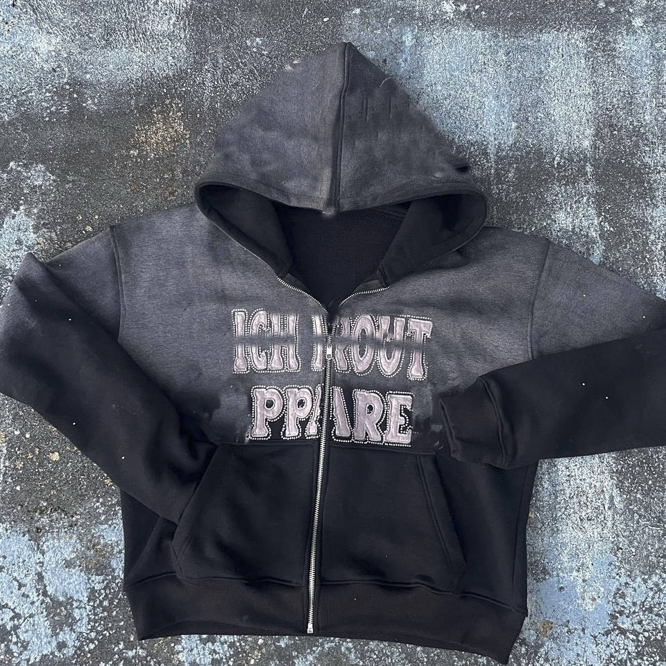 เสื้อฮู้ดดี้ผ้าฝ้ายเฟรนช์เทอร์รี่เนื้อหนัก 100% แบบสั่งทำพิเศษ ตกแต่งด้วยลายปักแบบซันเฟด ฮู้ดดี้ทรงครอป ล้างสีแบบแอซิดวอช ประดับด้วยคริสตัลปลอม ซิปหน้า สำหรับผู้ชาย