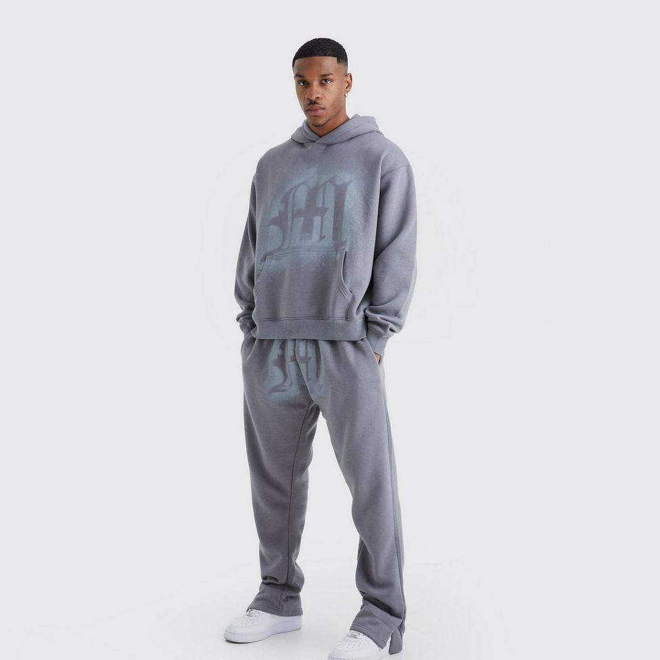 ชุดเซ็ตแทรคสูทโอเวอร์ไซส์ผ้าฝ้ายแท้ 100% พิมพ์ลายพัฟฟ์ พร้อมเสื้อฮู้ดแบบสวมหัว ผลิตจากโรงงาน