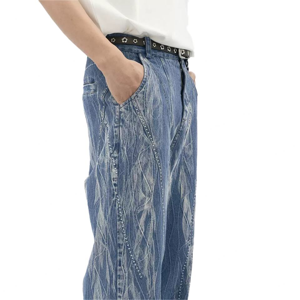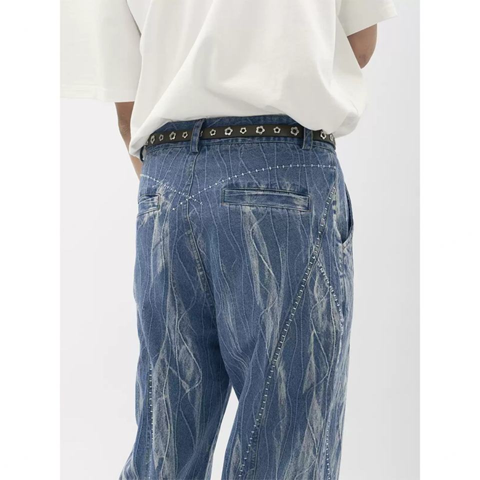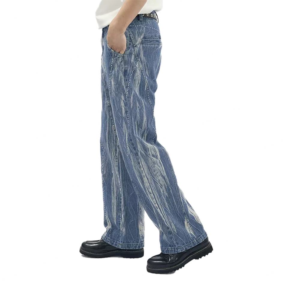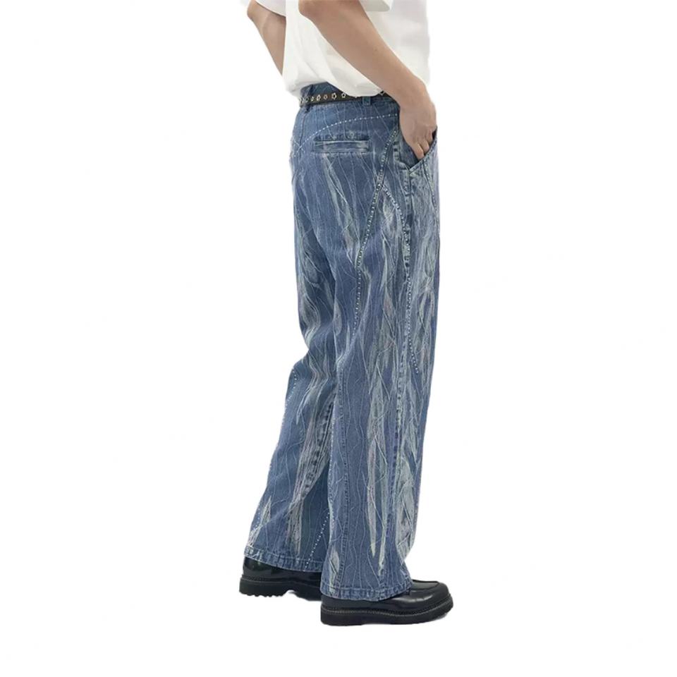 กางเกงยีนส์ทรงตรงผ้าฝ้ายแท้ 100% แบบวินเทจ ปักลาย ลำลอง สีน้ำเงินสำหรับผู้ชาย