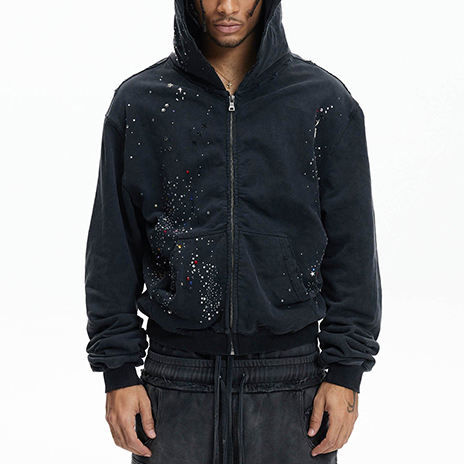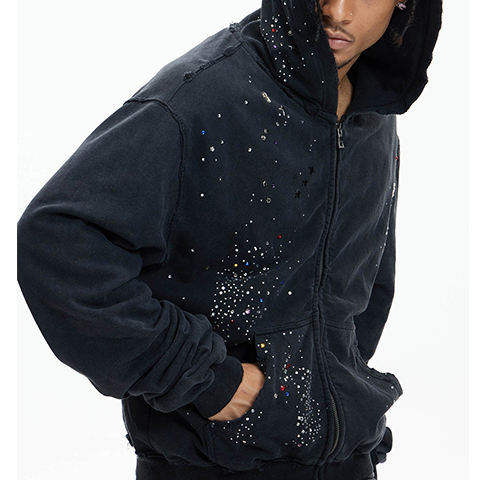 Custom 100% Cotton Vintage French Terry Acid Washed Rhinestone Crystal-embellished Front Zip-up Breathable Hoodie Diamond Winter