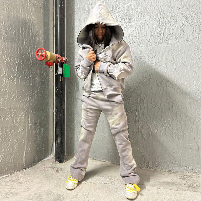 ชุดเซ็ตสตรีทแวร์แบบมีฮู้ดลายฟอกสีสไตล์วินเทจ พร้อมกางเกงขายาวทรงบานมีเชือกผูกเอว