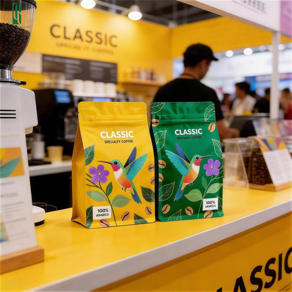 ถุงกาแฟพลาสติกแบบกำหนดเอง ขนาด 12 ออนซ์ 250 กรัม 500 กรัม 1 กิโลกรัม แบบก้นแบน มีซิปและวาล์ว สำหรับบรรจุภัณฑ์อาหารและกาแฟ