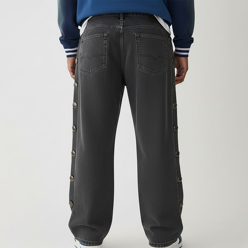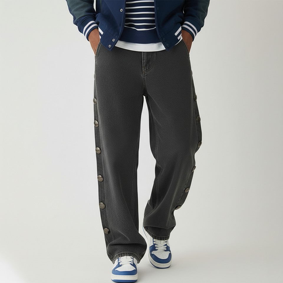 กางเกงยีนส์เดนิมทรงตรงแบบแบ็กกี้ หนา 14 ออนซ์ สองชั้น ติดกระดุมด้านข้าง สไตล์ฮิปฮอป แฟชั่นสตรีท สำหรับผู้ชาย ขายส่ง รุ่นใหม่