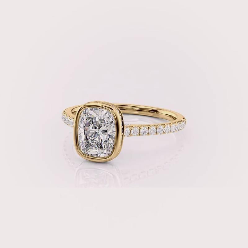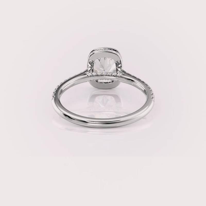 แหวนหมั้นเพชรทรงคุชชั่นคัตที่เพาะเลี้ยงในห้องปฏิบัติการ ทองคำ 14K สีโรส/ไวท์/เยลโลว์ พร้อมวงแหวนล้อมเพชรแบบ Halo และ Pave Shank