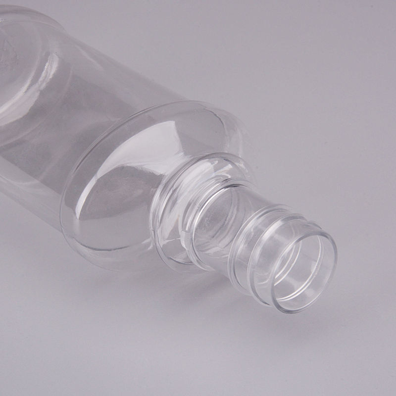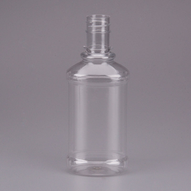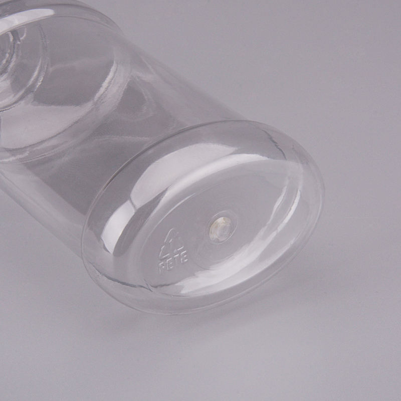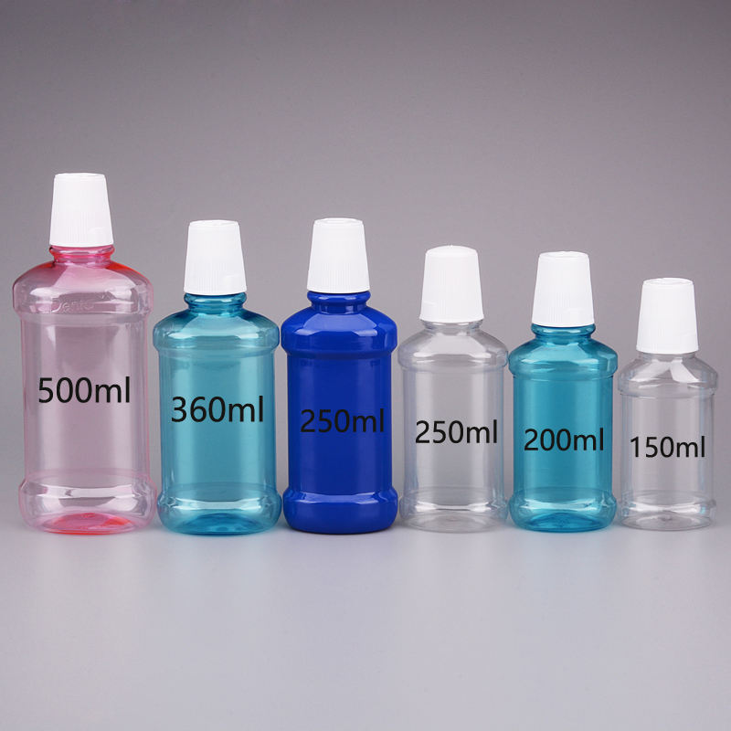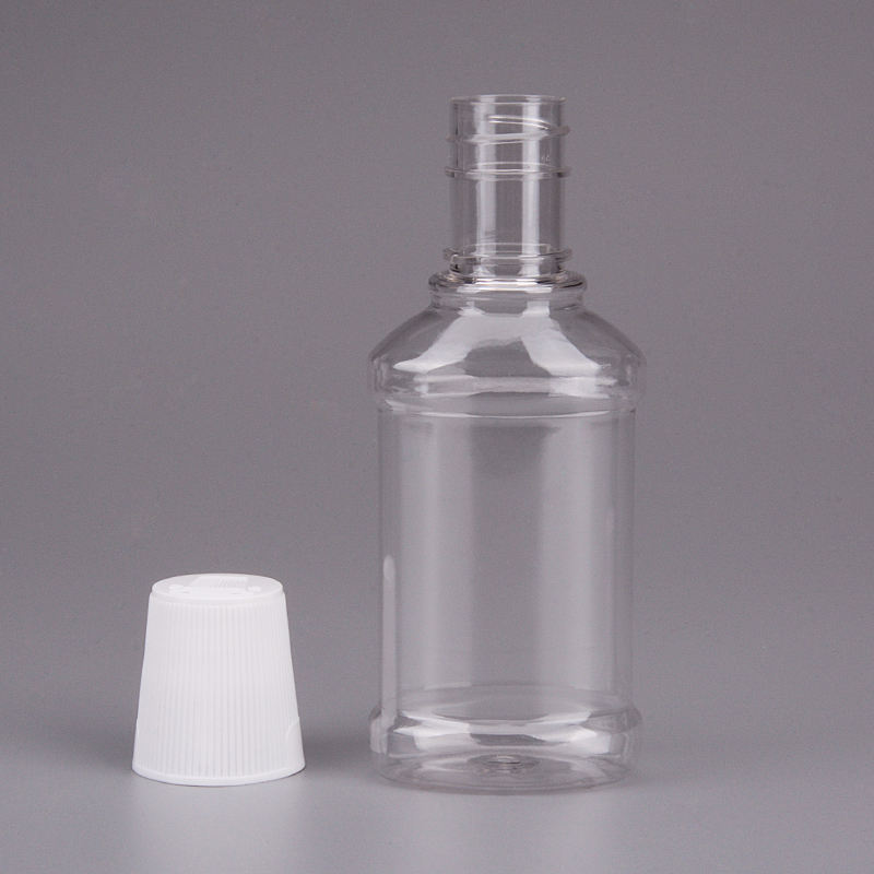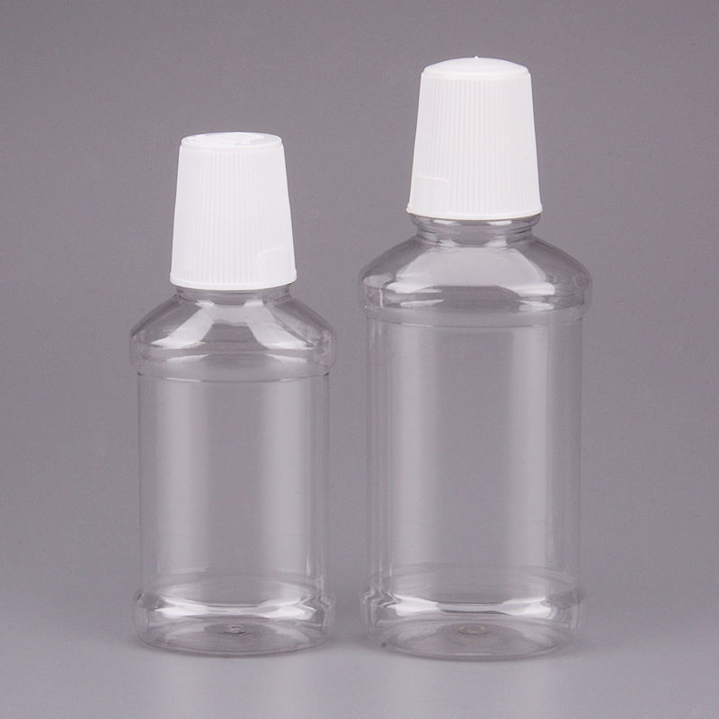ขวดพลาสติกใสทรงแบน PET ขนาด 150 มล. 5 ออนซ์ แบบกำหนดเอง พร้อมถ้วยตวง ฝาเกลียว 28/425 สำหรับชุดเดินทางดูแลช่องปาก