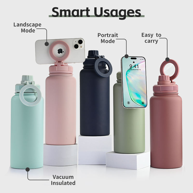กระติกน้ำสุญญากาศแบบกำหนดเอง 1 ลิตร 32 ออนซ์ ผนังสองชั้น สแตนเลสสตีล พร้อมที่ยึดโทรศัพท์แม่เหล็ก ปลอดสาร BPA ใช้กับน้ำเดือดได้