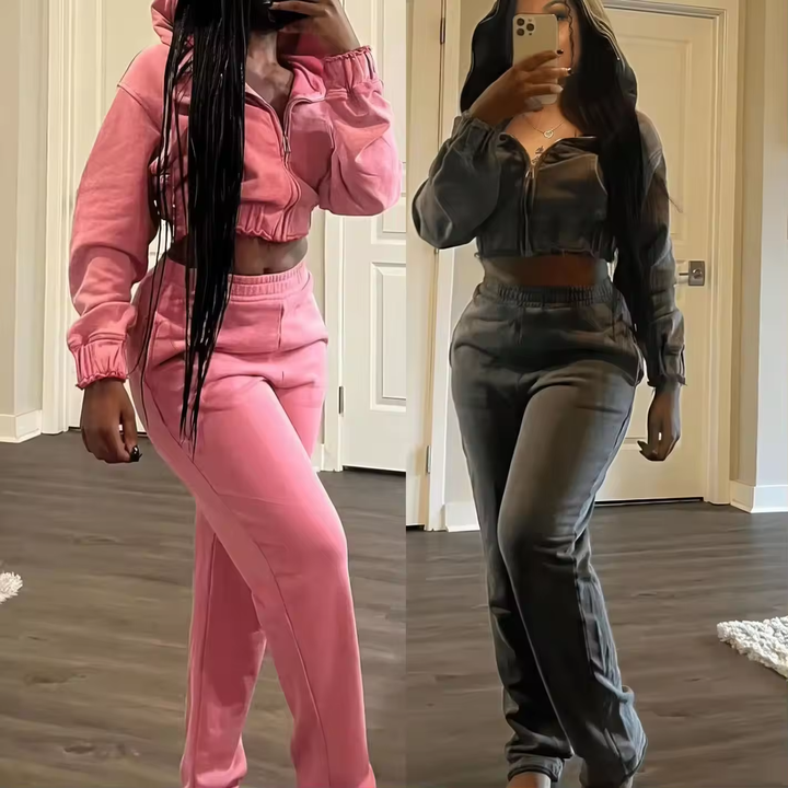 ชุดวอร์ม2ชิ้นสำหรับผู้หญิงชุดครอปแบบมีฮู้ดและกางเกงวอร์มแต่งซิปลายปัก