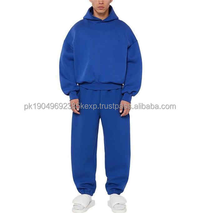 ชุดเซ็ต 2 ชิ้น สีน้ำเงินรอยัล ผ้าหนา 350GSM 400GSM 450GSM แบบยูนิเซ็กซ์ เสื้อฮู้ดดี้และกางเกงขายาวทรงโอเวอร์ไซส์สำหรับผู้ชาย