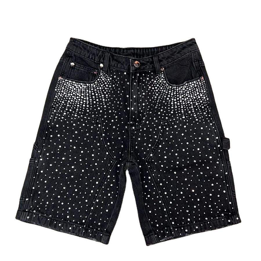 กางเกงขาสั้นผ้ายีนส์สำหรับผู้ชายกางเกงขาสั้นทรงหลวมประดับคริสตัลและประกายเพชรทรงหลวม2025ออกแบบได้ตามต้องการ