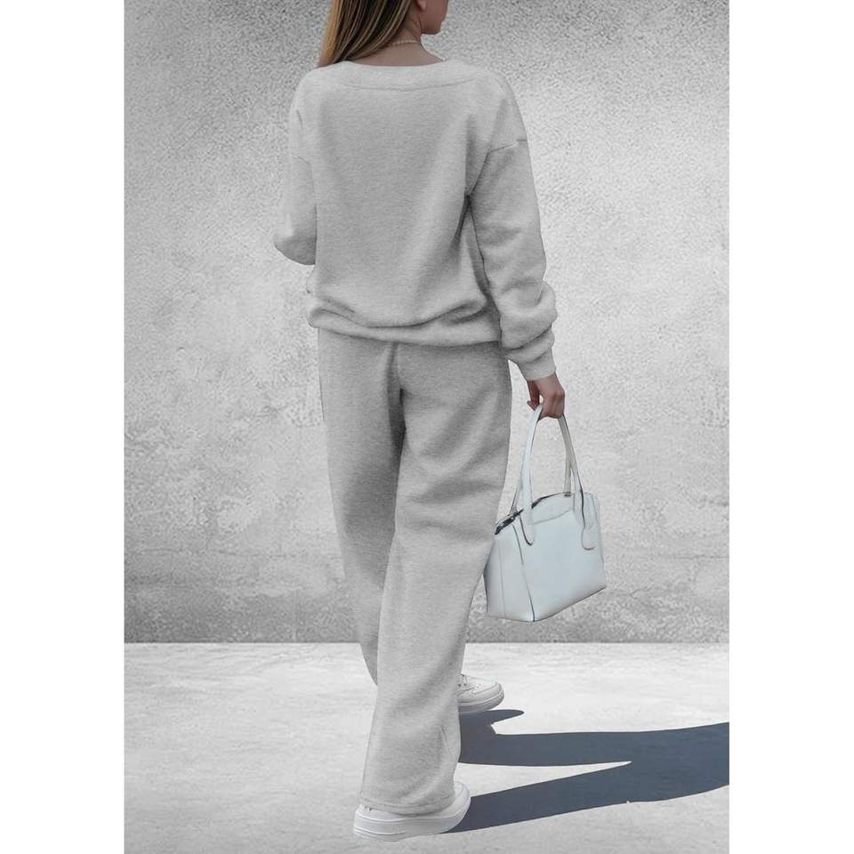 ชุดลำลองฤดูหนาวสำหรับผู้หญิงปี 2025 แบบสองชิ้น เสื้อสเวตเชิ้ตคอวี กางเกงขายาวทรงหลวม ชุดลำลองสำหรับฤดูใบไม้ร่วง พร้อมชุดวอร์มถัก