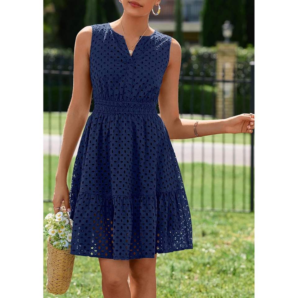ชุดเดรสยาวทรงเอไลน์สำหรับผู้หญิง คอลเลคชั่นฤดูร้อน ปี 2025 แบบไม่มีแขน คอวี ลายฉลุ เหมาะสำหรับใส่ไปเที่ยวทะเล ช่วงวันหยุดพักผ่อน