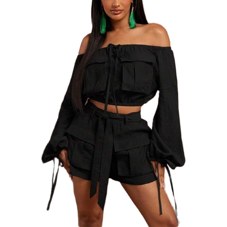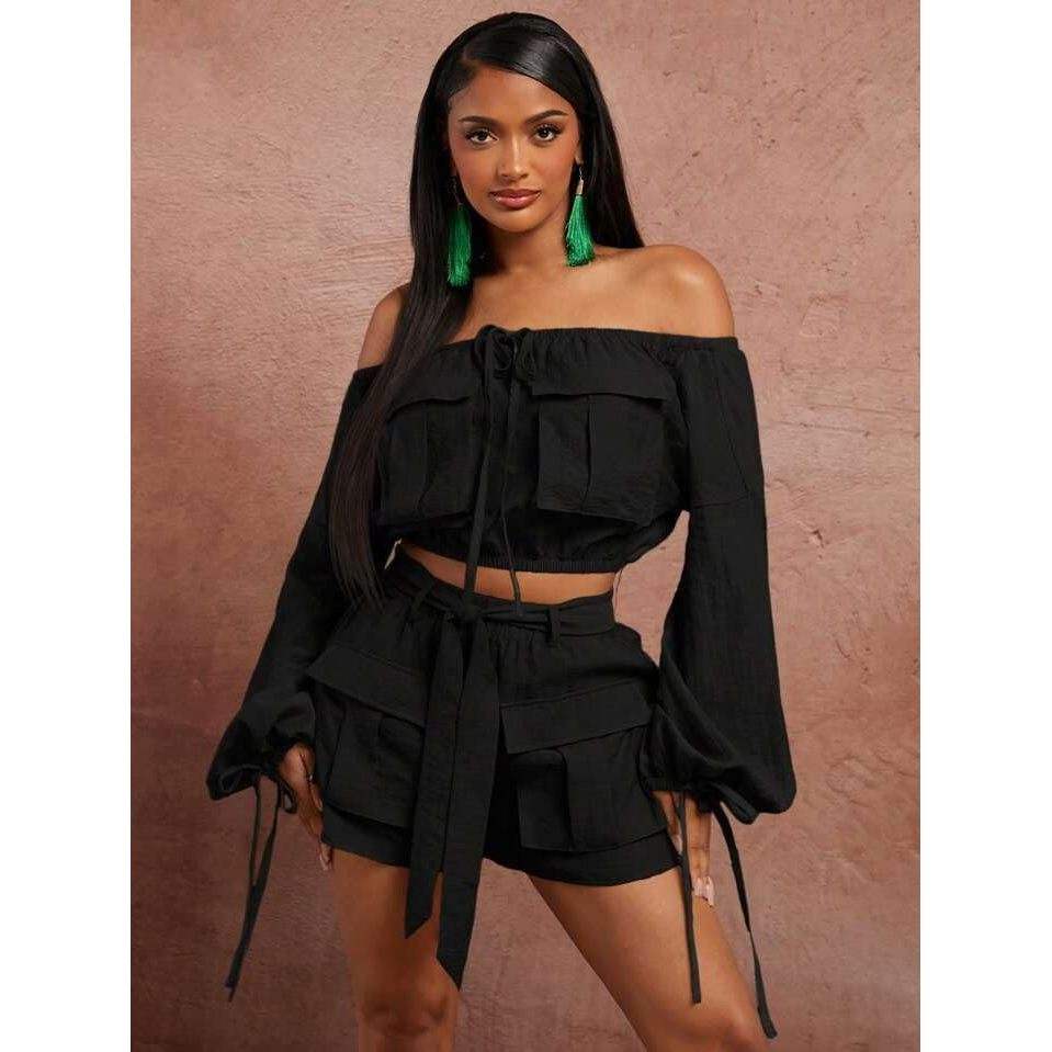 ชุดเซ็ต 2 ชิ้น รุ่นคัสตอม 2026 สำหรับผู้หญิง เสื้อแขนยาวเปิดไหล่ กางเกงขาสั้น สไตล์ Y2K ผ้าแคนวาส ชุดฤดูใบไม้ผลิและฤดูร้อน