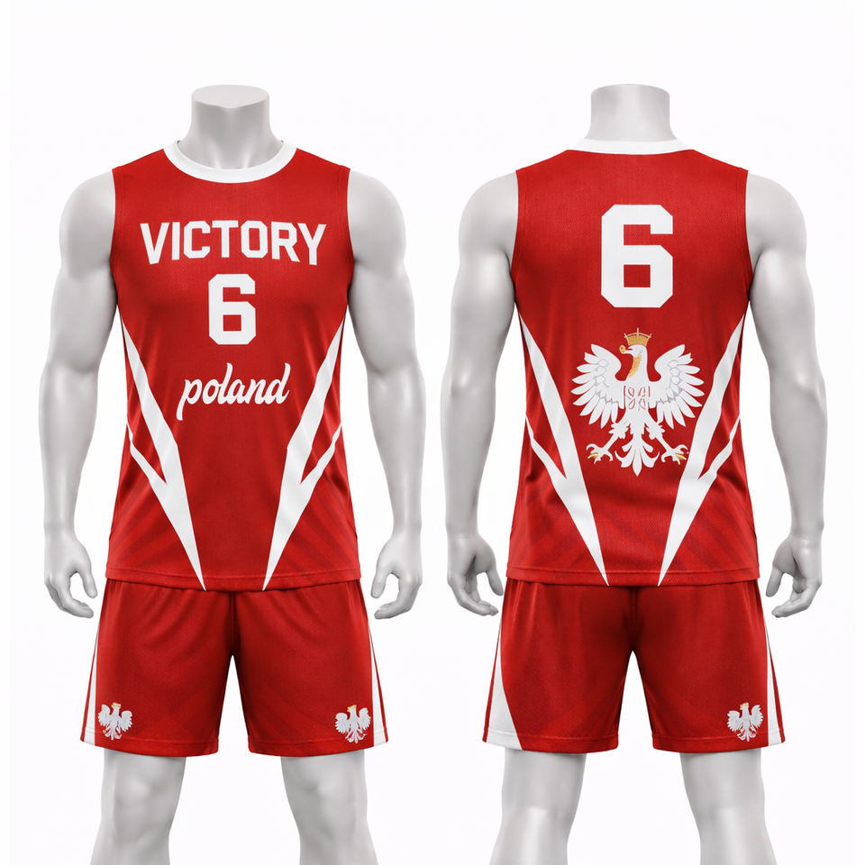 ชุดเสื้อวอลเลย์บอลสไตล์โปแลนด์แบบกำหนดเองปี 2026 ชุดยูนิฟอร์มวอลเลย์บอลแขนกุดสีแดงสำหรับผู้ชายพร้อมกางเกงขาสั้น ชื่อและหมายเลขส่วนบุคคล