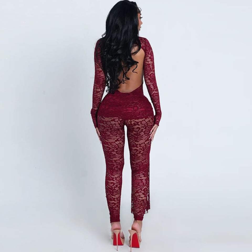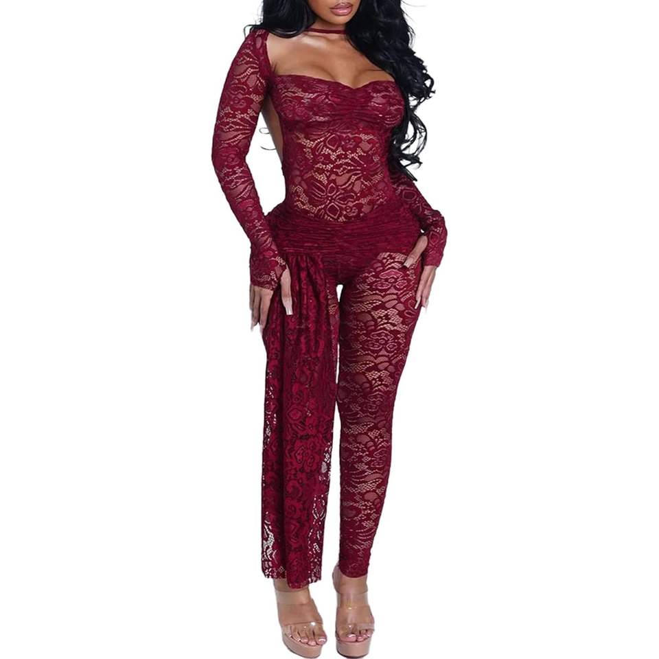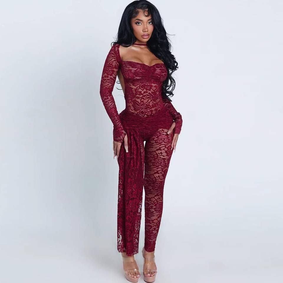 ชุดเซ็กซี่ลูกไม้สองชิ้นแบบสั่งทำพิเศษ ปี 2026 เสื้อแขนยาวเข้ารูปและกางเกงขายาวผ้าบางโปร่งใส สไตล์คลับแวร์แฟชั่น Y2K