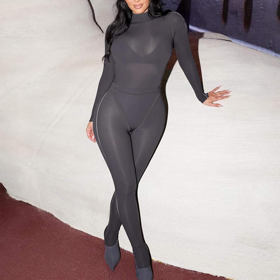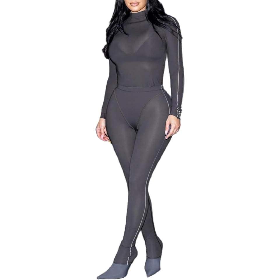 ชุดเซ็กซี่สองชิ้นแบบสั่งทำพิเศษ ปี 2026 สำหรับผู้หญิง บอดี้สูทแขนยาว ชุดตาข่าย คอสูง ทรงเข้ารูป โปร่งแสง เหมาะสำหรับใส่ไปเที่ยวคลับ