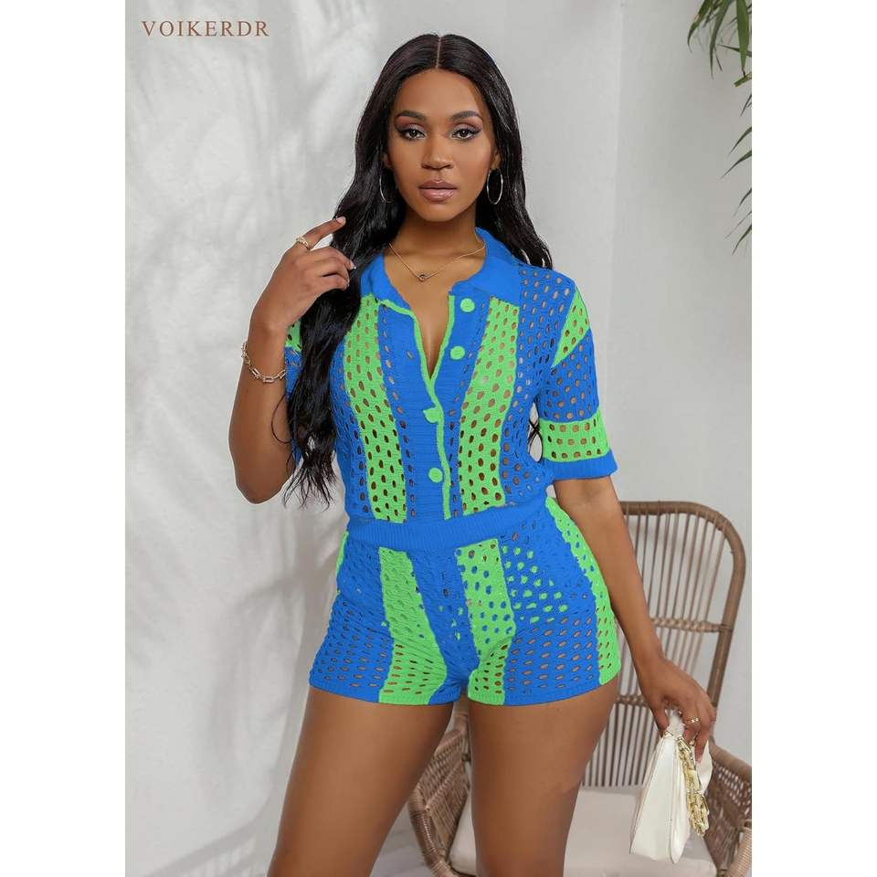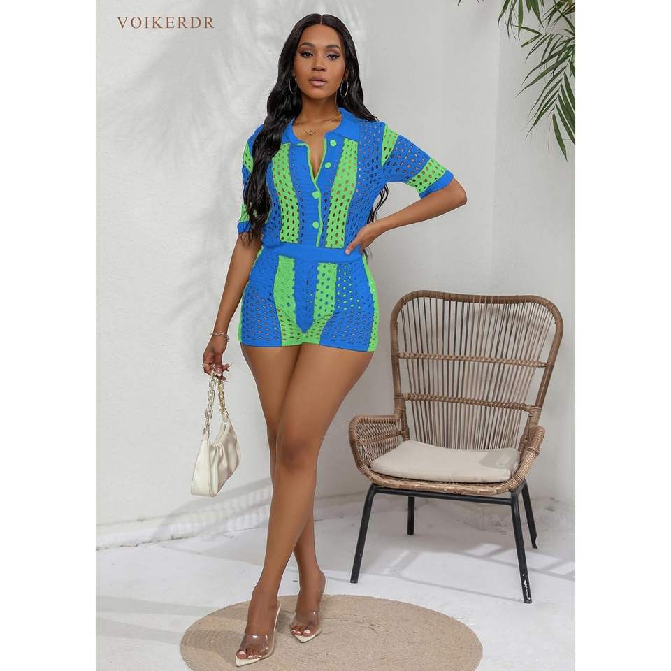 Custom 2026 Women 2 Piece Crochet Hollow Out Shirt And Shorts Set V Neck Breathable Summer Beach Wear Blue Green