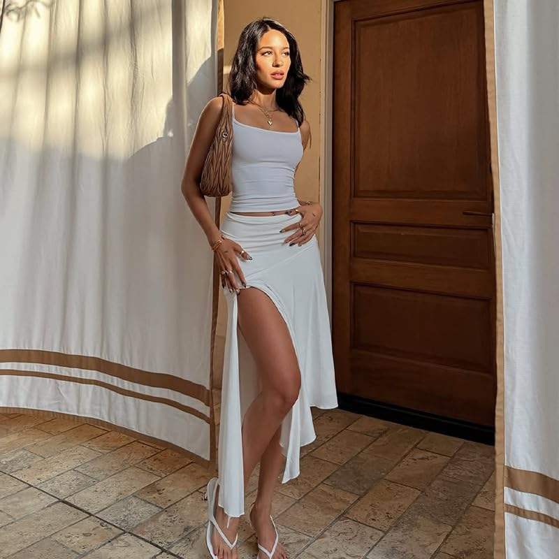ชุดเซ็ต 2 ชิ้นสำหรับผู้หญิง คอลเลคชั่น 2026 เสื้อแขนกุดเปิดไหล่และกระโปรงมิดิผ่าข้าง ผ้าชีฟองทรงเข้ารูป ชุดเที่ยวพักผ่อน ฤดูใบไม้ผลิ ฤดูร้อน