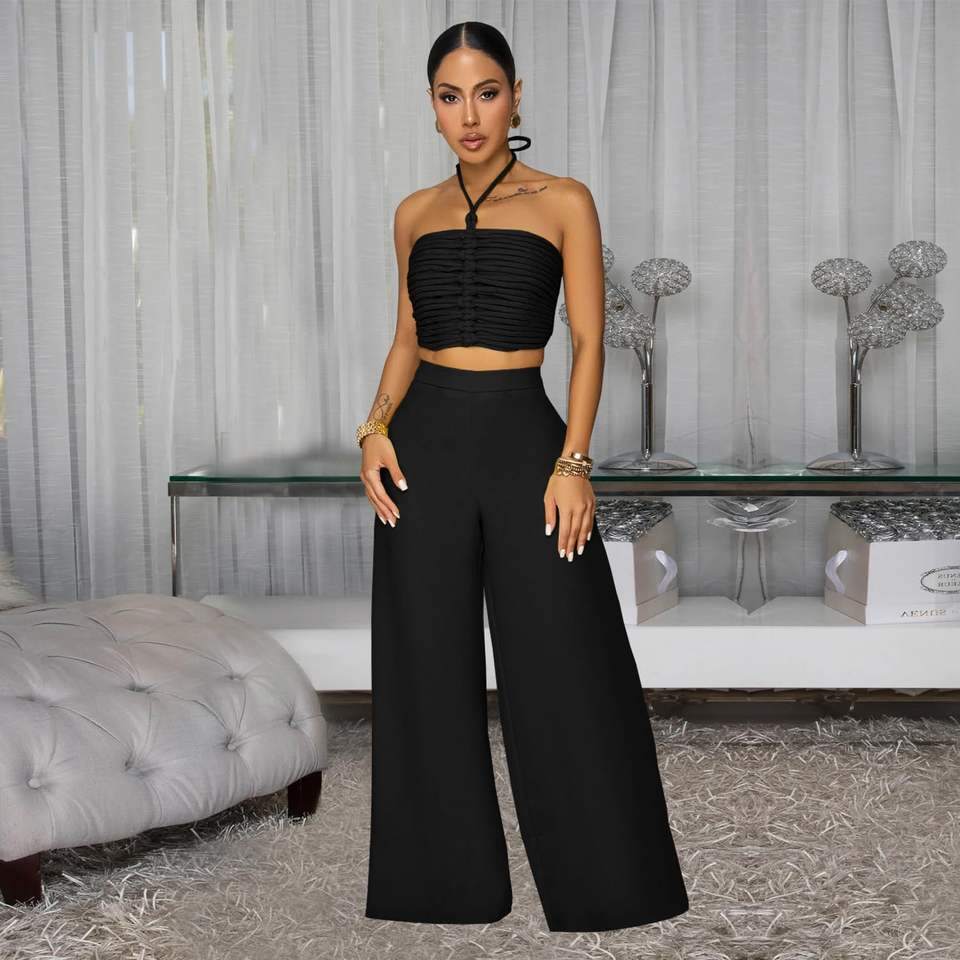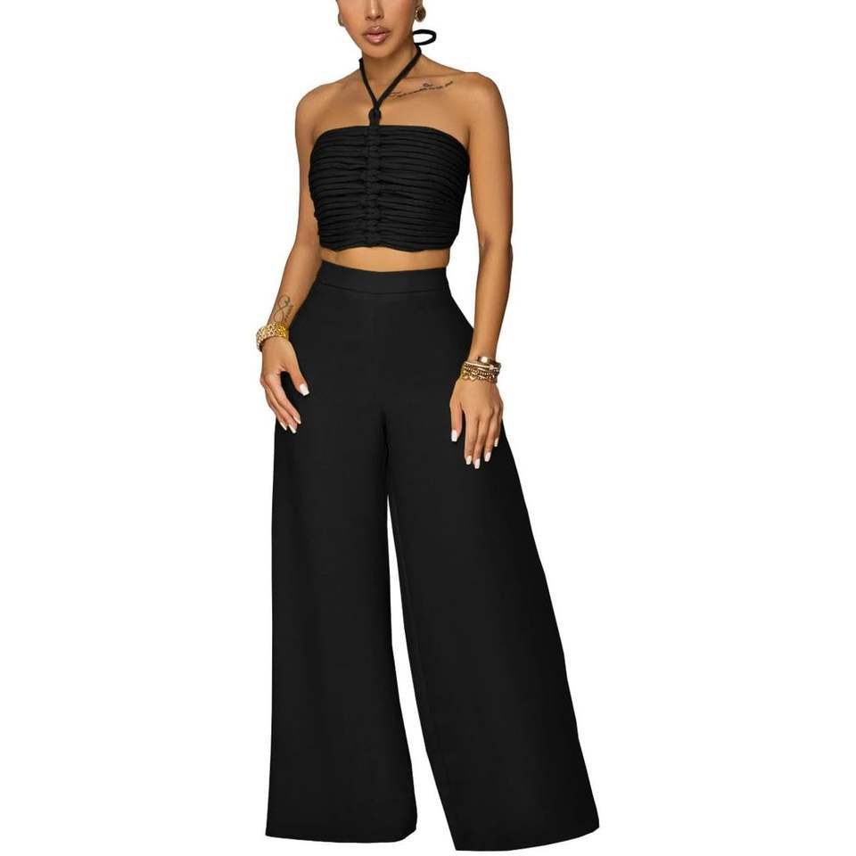 ชุดเซ็ต 2 ชิ้นสำหรับผู้หญิง รุ่นคัสตอม 2026 เสื้อแขนกุดแบบผูกคอและกางเกงขายาวทรงตรง ผ้าเนื้อยืด ระบายอากาศดี แต่งเชือกผูก เหมาะสำหรับงานปาร์ตี้