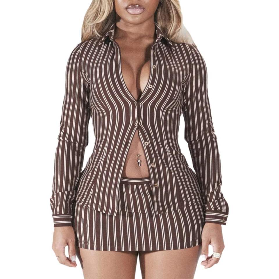 ชุดเซ็ตเสื้อเชิ้ตแขนยาวลายทางและกระโปรงสั้น 2 ชิ้นสำหรับผู้หญิง รุ่นคัสตอม 2026 เหมาะสำหรับใส่ออกไปข้างนอก