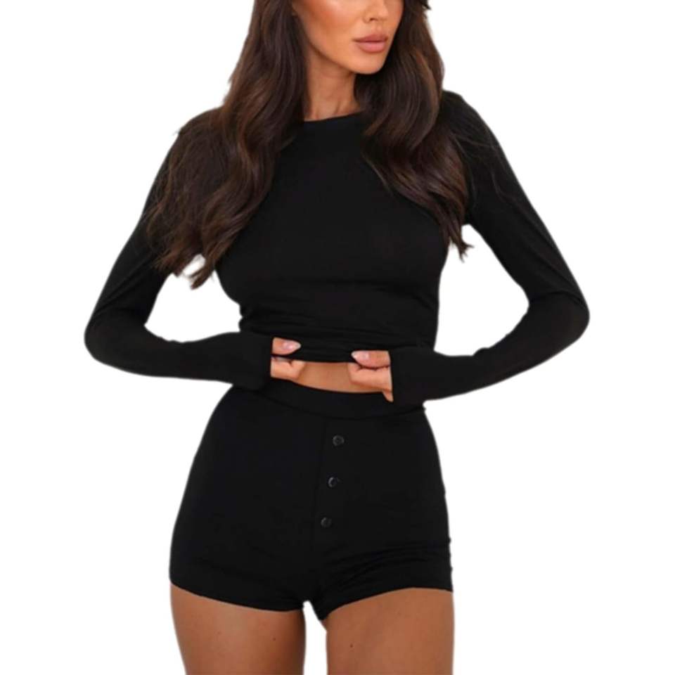Custom 2026 Women's 2 Piece Lounge Set Full Sleeve Stretchy Top Button Shorts Casual Outfits Breathable Knitting Spandex Cotton