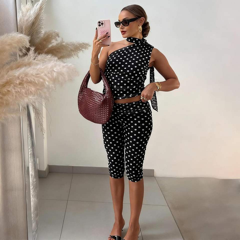 ชุดเซ็ต 2 ชิ้นลายจุดสำหรับผู้หญิง รุ่นคัสตอม 2026 เสื้อเปิดไหล่ข้างเดียวและกางเกงขายาวทรงแคปรี ชุดเซ็กซี่สไตล์ Y2K ผ้าระบายอากาศได้ดี ผลิตจากผ้าสแปนเด็กซ์และโพลีเอสเตอร์
