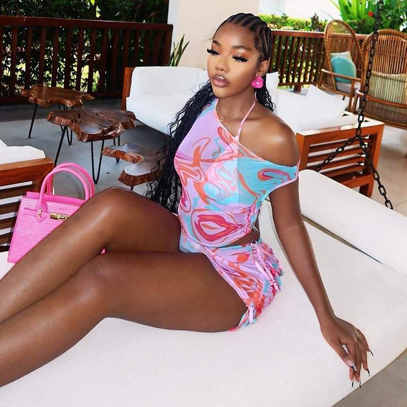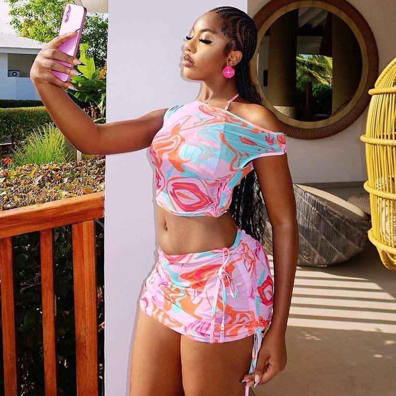 ชุดเซ็ต 2 ชิ้นสำหรับผู้หญิง คอลเลคชั่น 2026 เสื้อครอปเปิดไหล่ผ้าตาข่าย กระโปรงมินิผ้าชีฟองรูดเชือก เซ็กซี่ เหมาะสำหรับใส่ไปเที่ยวคลับ ฤดูใบไม้ผลิ ฤดูร้อน