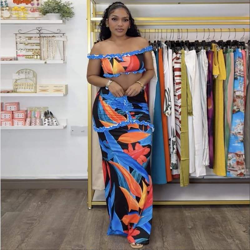 ชุดเซ็ต 2 ชิ้นสำหรับผู้หญิง รุ่นคัสตอม 2026 เสื้อครอปเปิดไหล่ กระโปรงยาวทรงเอวสูงระบายพลิ้ว ชุดลำลองใส่สบาย ระบายอากาศได้ดี