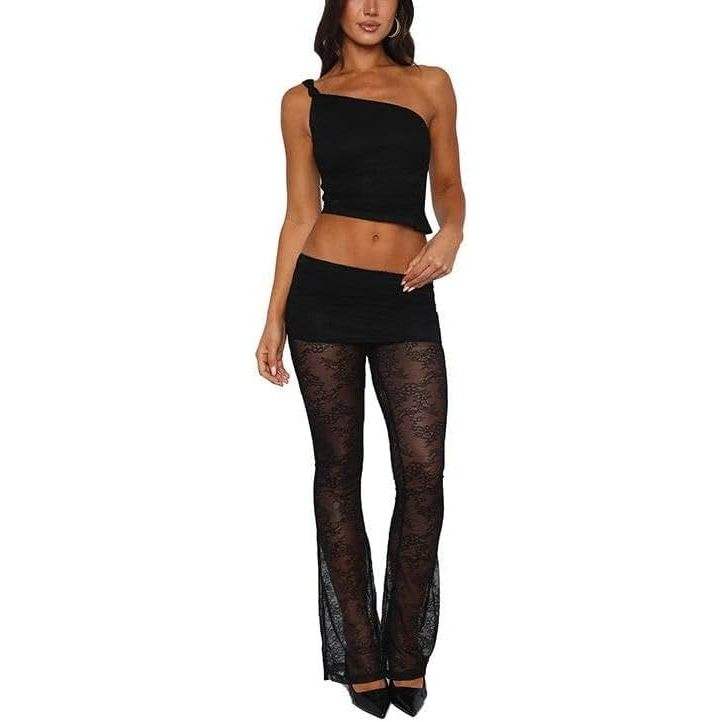 ชุดเซ็ต 2 ชิ้นสำหรับผู้หญิง รุ่นคัสตอม 2026 เสื้อเปิดไหล่ข้างเดียว กางเกงลูกไม้ ชุดเซ็กซี่ ผ้าสแปนเด็กซ์ ไนลอน ระบายอากาศได้ดี