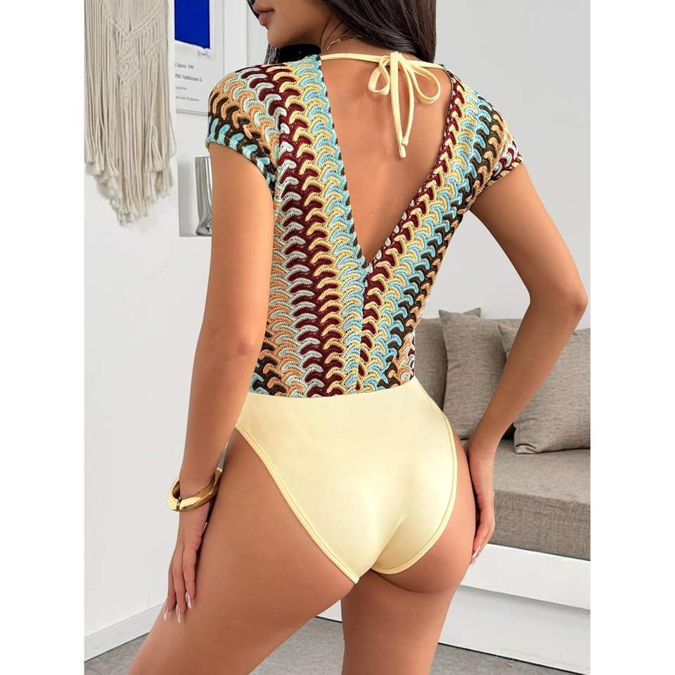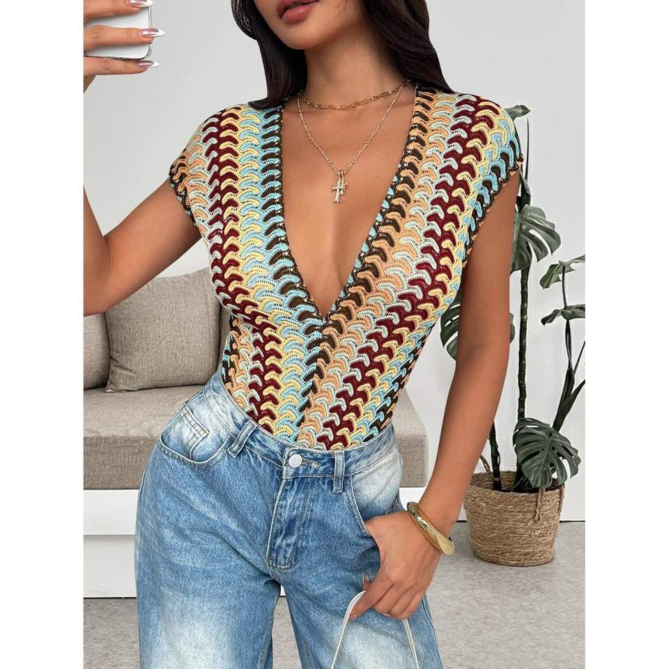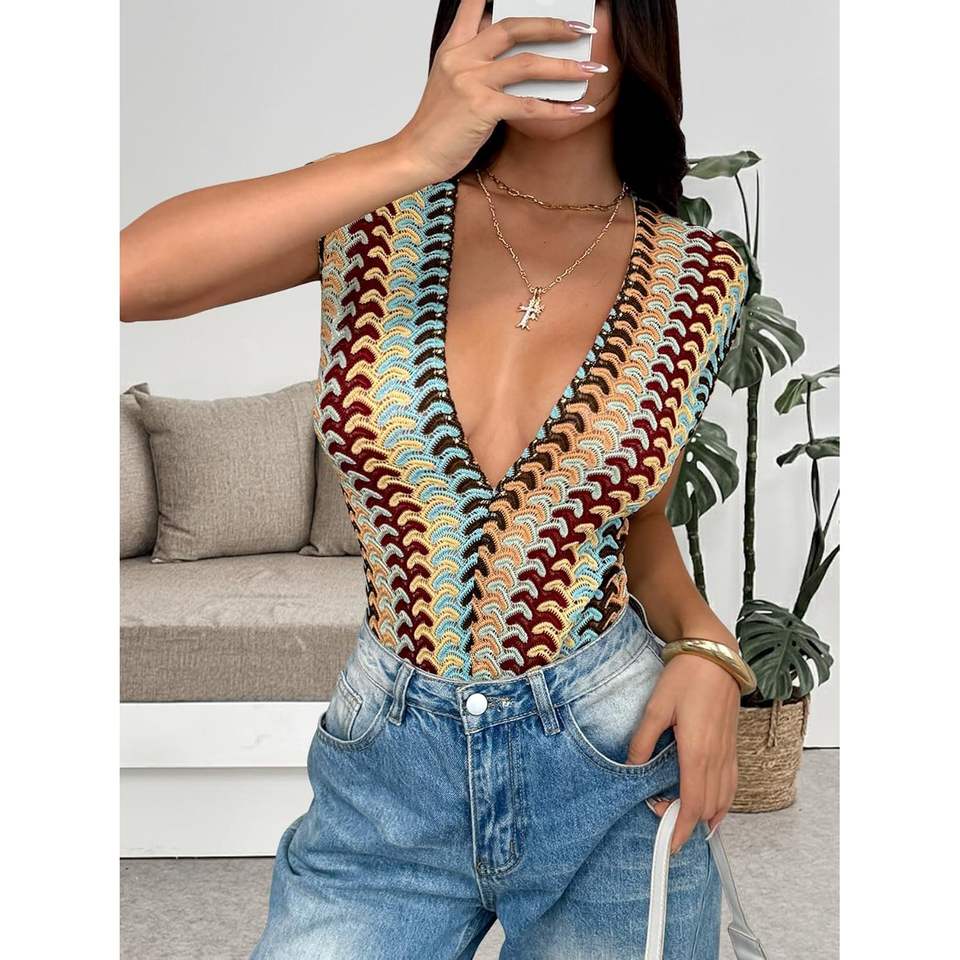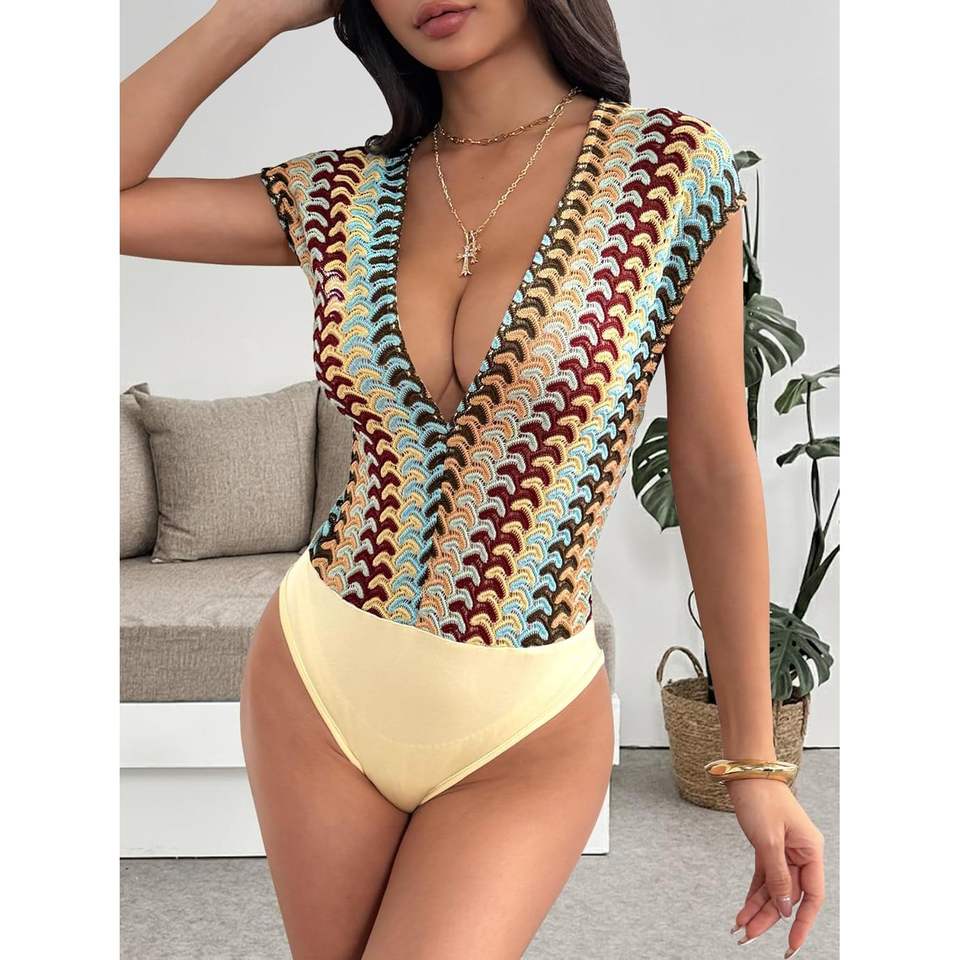 ชุดบอดี้สูทโครเชต์สีสันตัดกันสำหรับผู้หญิง รุ่นคัสตอม 2026 คอลูกไม้เว้าลึก ยืดหยุ่นได้ สไตล์ Y2K โบโฮ เหมาะสำหรับวันพักผ่อน