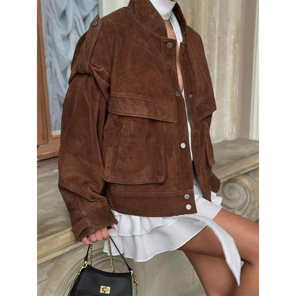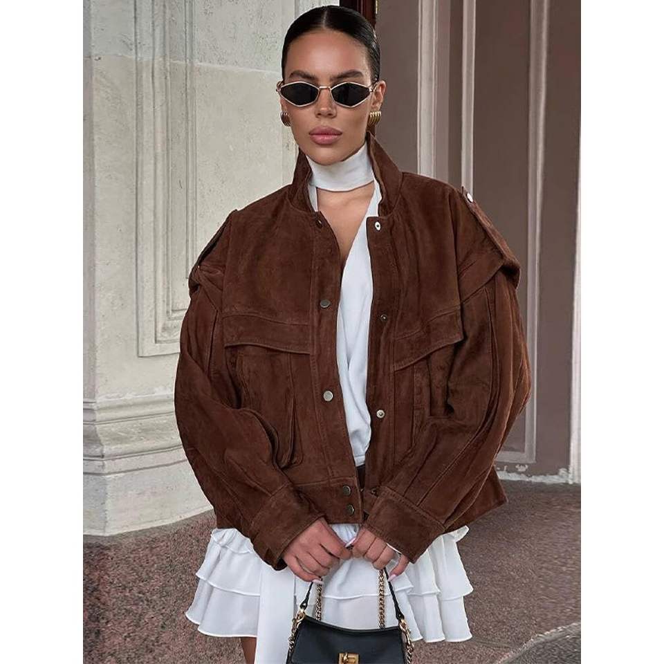 แจ็คเก็ตบอมเบอร์หนังวัวแท้สำหรับผู้หญิง รุ่นคัสตอม 2026 แขนยาว แฟชั่นทันสมัย แจ็คเก็ตมอเตอร์ไซค์หนังเทียมสำหรับผู้หญิง