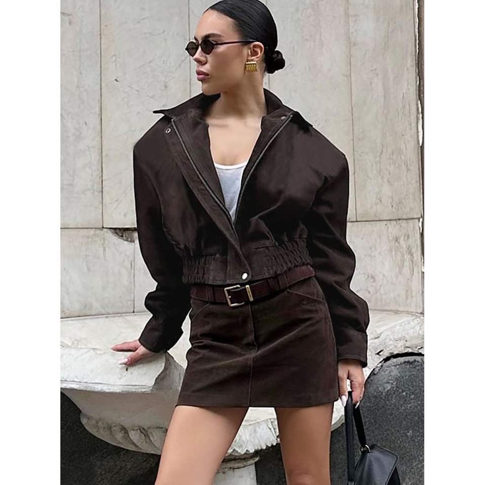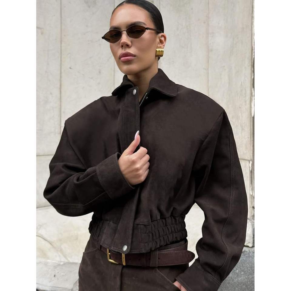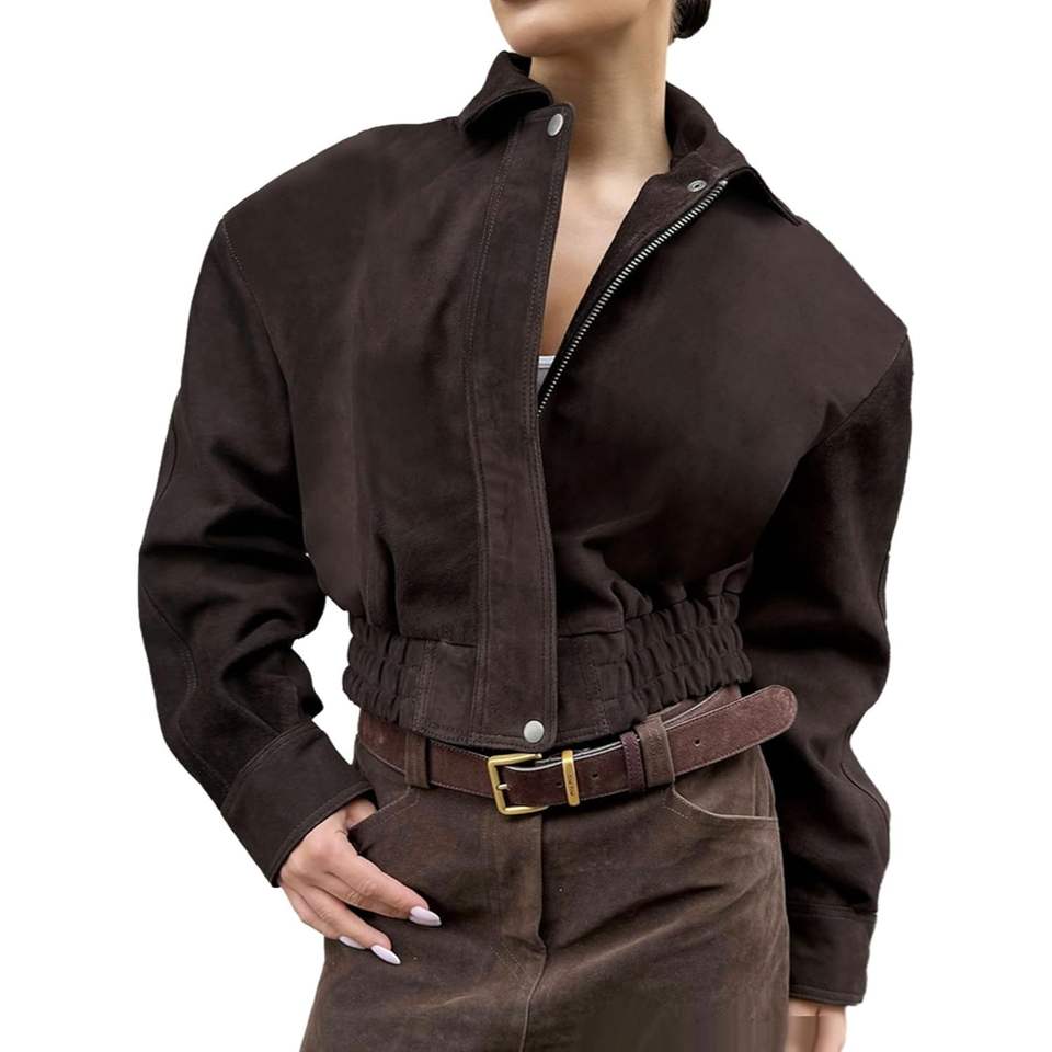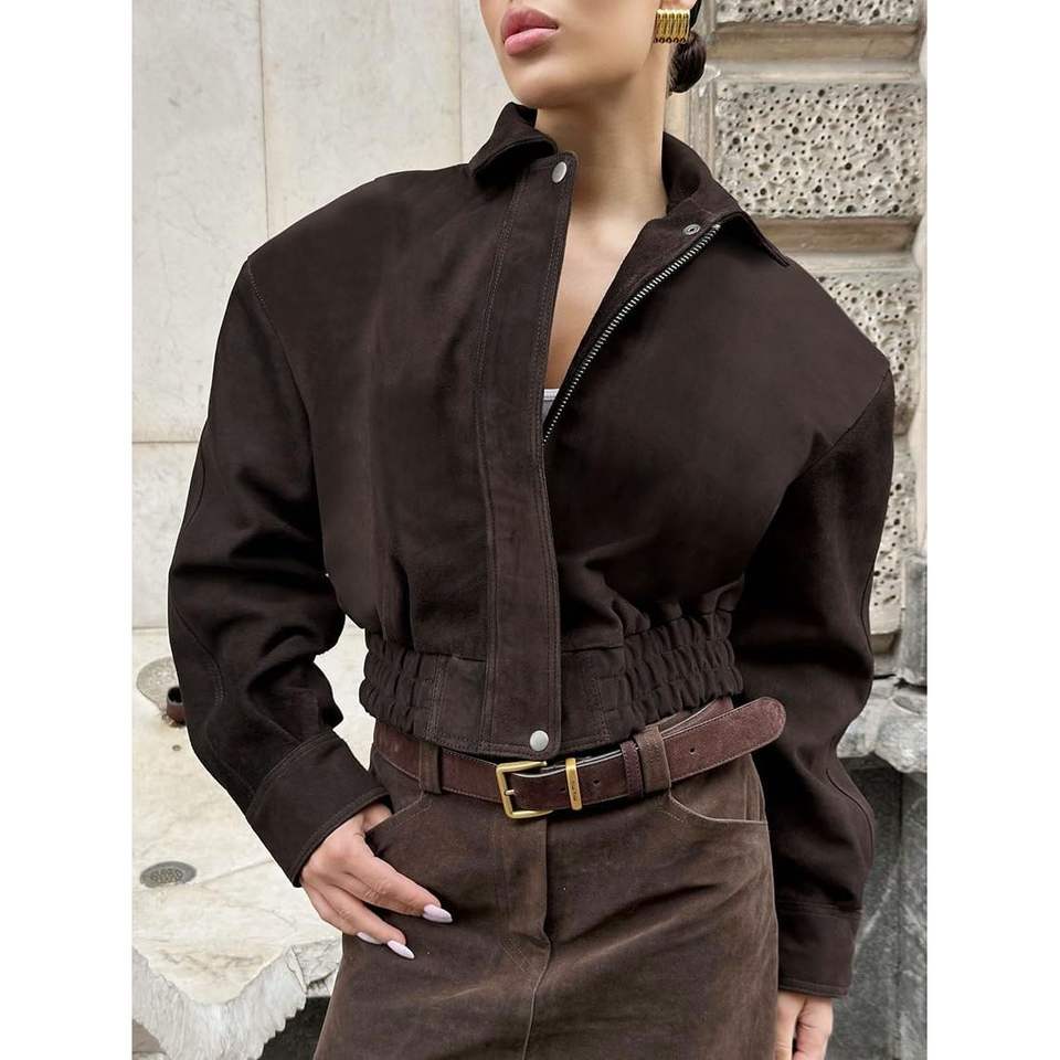 เสื้อแจ็คเก็ตมอเตอร์ไซค์ผู้หญิงแบบสั่งทำพิเศษ ปี 2026 ผ้าหนังกลับเทียม แขนยาว ซิปหน้า กันลม เสื้อนอกสำหรับฤดูใบไม้ร่วง