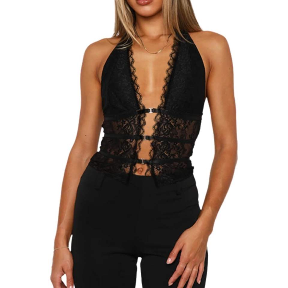 Custom 2026 Women's Lace Halter Top Sleeveless Deep V Neck Sheer Layer Party Tank Top Solid Color