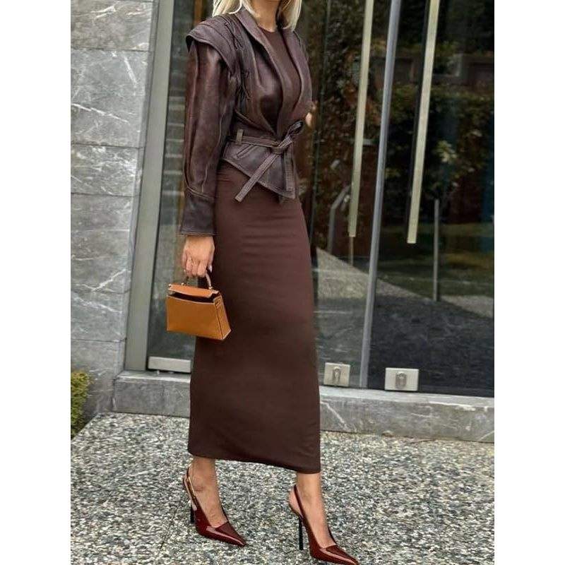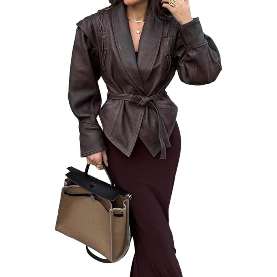 Custom 2026 Women's Leather Jacket Wrap And Tie Full Sleeve Brown Cow Skin Autumn Outfit With Belt
